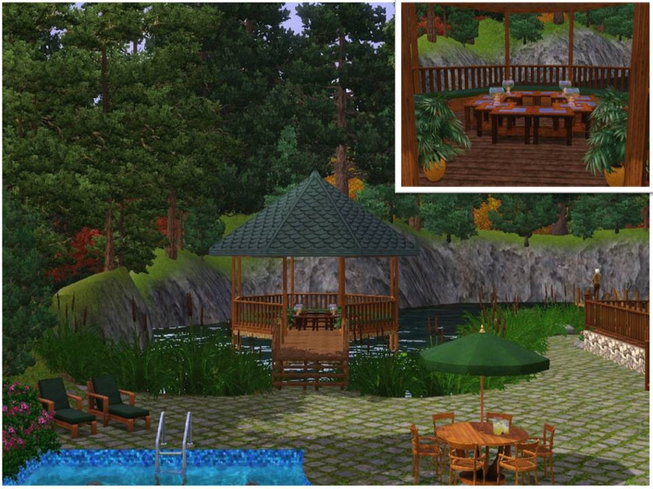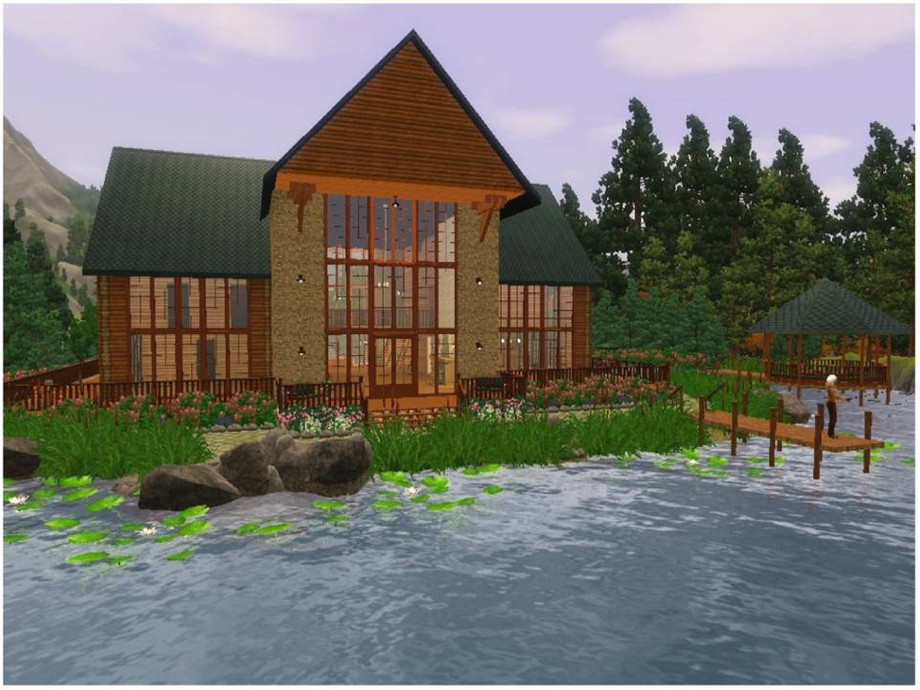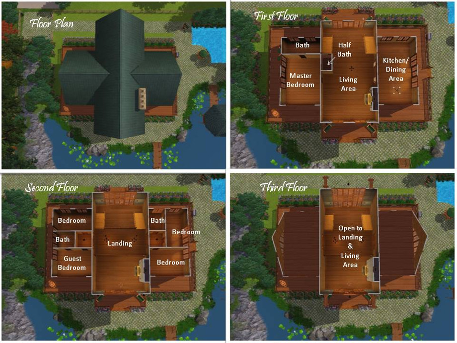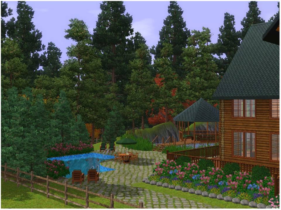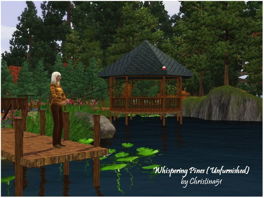 This lot was originally built on a 64x64 lot in Sunset Valley at 13 Skyborough Blvd., in place of the Goth Manor. It will work on any 64x64 lot but, if you want to place it at this location, you will need to go to Edit Town, bulldoze the Goth Manor (evict the household), bulldoze the resulting vacant lot, go to World Editor and put a 64x64 lot in its place, return to Edit Town, and place Whispering Pines on the lot with the front of the house facing the street. To obtain the heavily wooded look of the screenshots, you will need to go to World Editor and place trees on the land surrounding this lot.