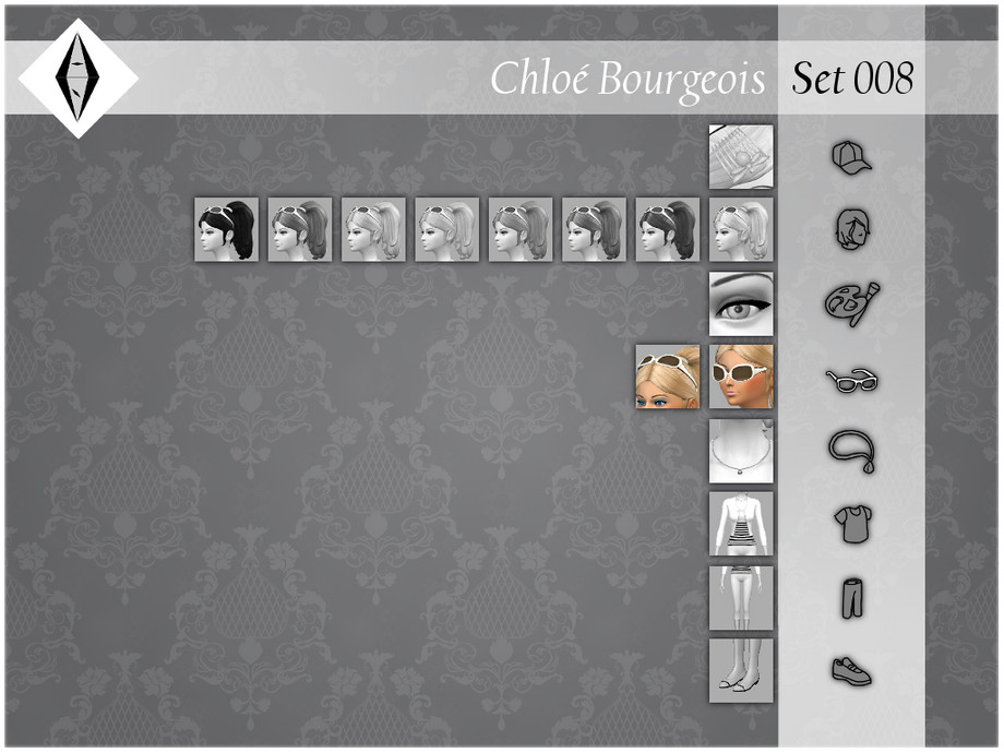 The sunglasses come in two CAS items, one that's on the top of the head and one used as a normal pair of glasses. The ones on the head are slightly edited to fit Chloe's hairstyle. They can be found in Glasses category and are disallowed for random.