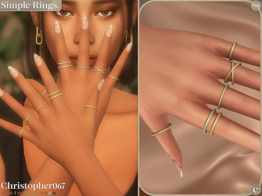 This is a simple but chic set of rings that you can mix and match! Each ring has a .package file and its own texture spot, so you can use all of these with each other and with other rings in the game!!