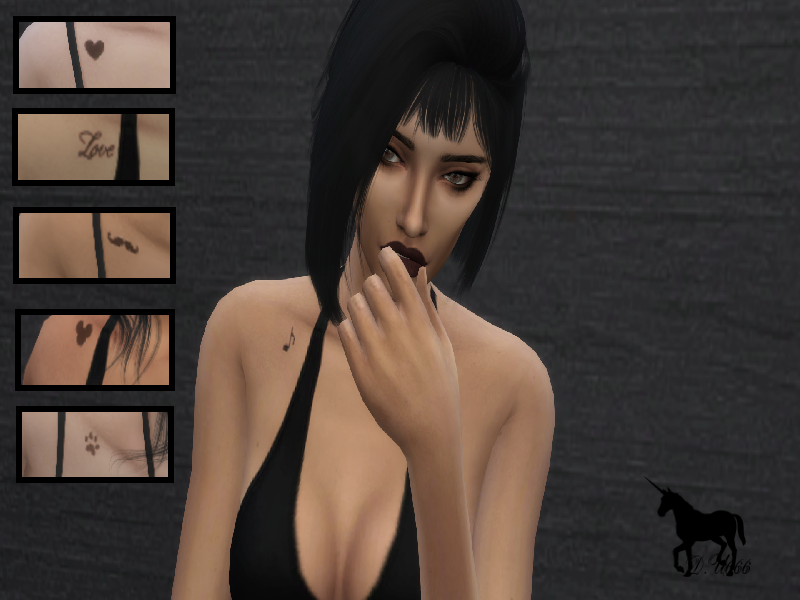 Let all that you do be done in love. These tattoos are located on the collar bone, Music Note, Love Heart, The Word Love, Mickey Mouse, Paw Print