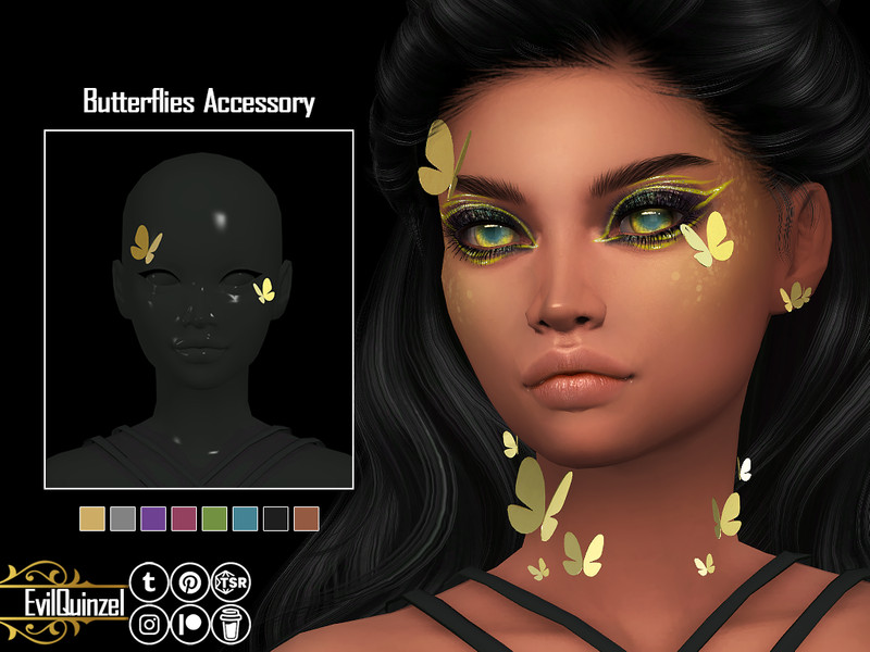 Metallic butterflies on each side of the face.