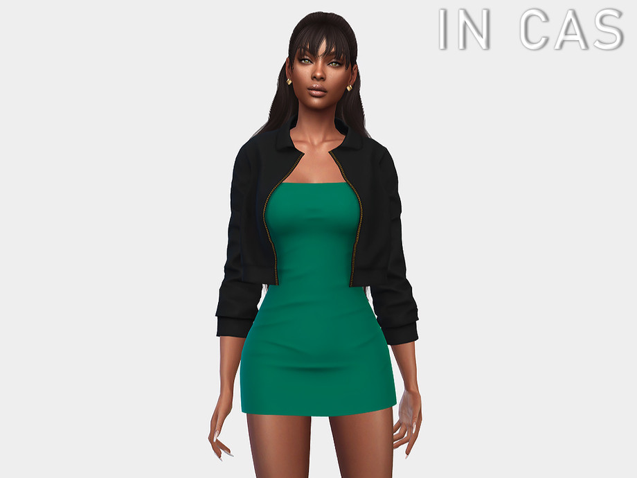 Bodycon mini dress paired with cropped bomber jacket featuring front zip and cuffed sleeves
