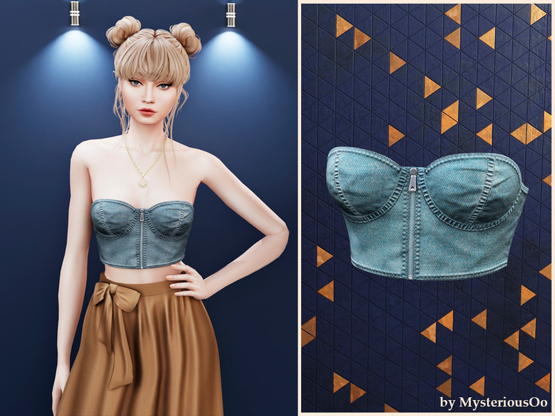 A structured denim bustier crafted with detailed stitching and a clean front zipper for a bold, modern silhouette