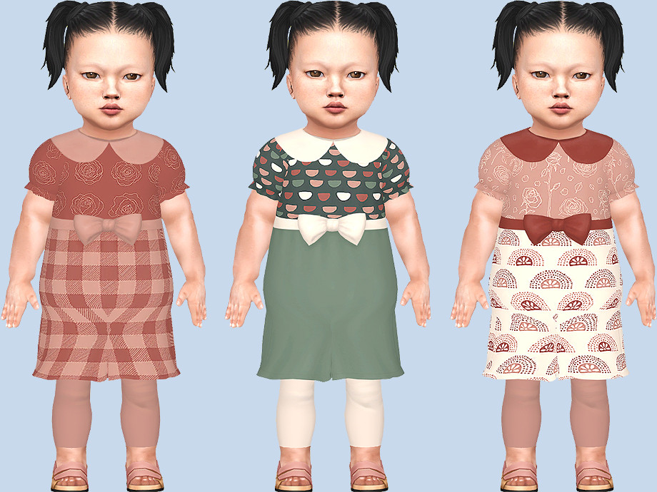 Five dresses with tights for infants girls with roses patterns and prints in rustic colours.