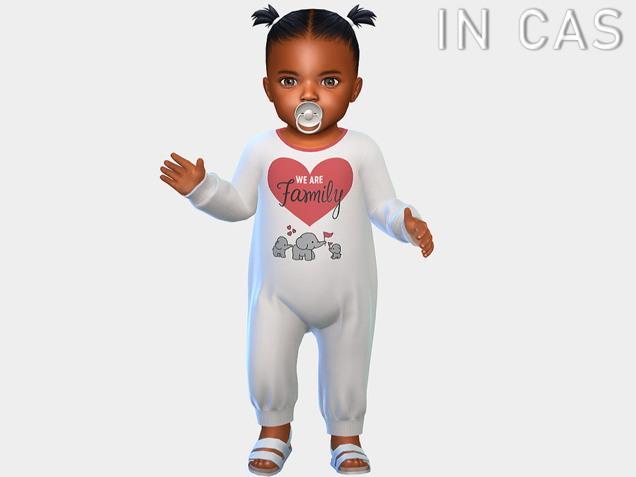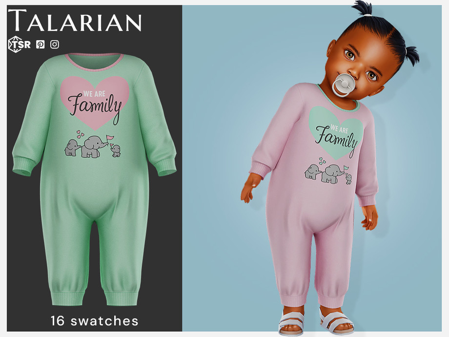 Cozy knit jumpsuit with long sleeves and cuffed hems, featuring a sweet heart and elephant print design with "We are Family" text detail. A comfy and adorable one-piece outfit, perfect for everyday wear.