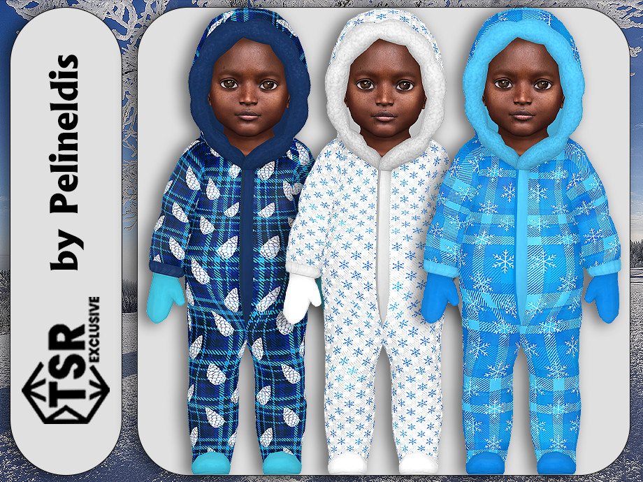 Kids fashion clothing: five snowsuits for infants boys and girls with winter prints in different shades of blue, white and grey.