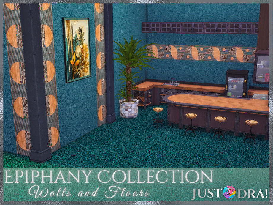 The Epiphany Carpets are a set of seven solid, textured floor swatches that match the Epiphany Walls color palette: Dark Green, Light Green, Purple, Lavender, Tan, White, and Grey.