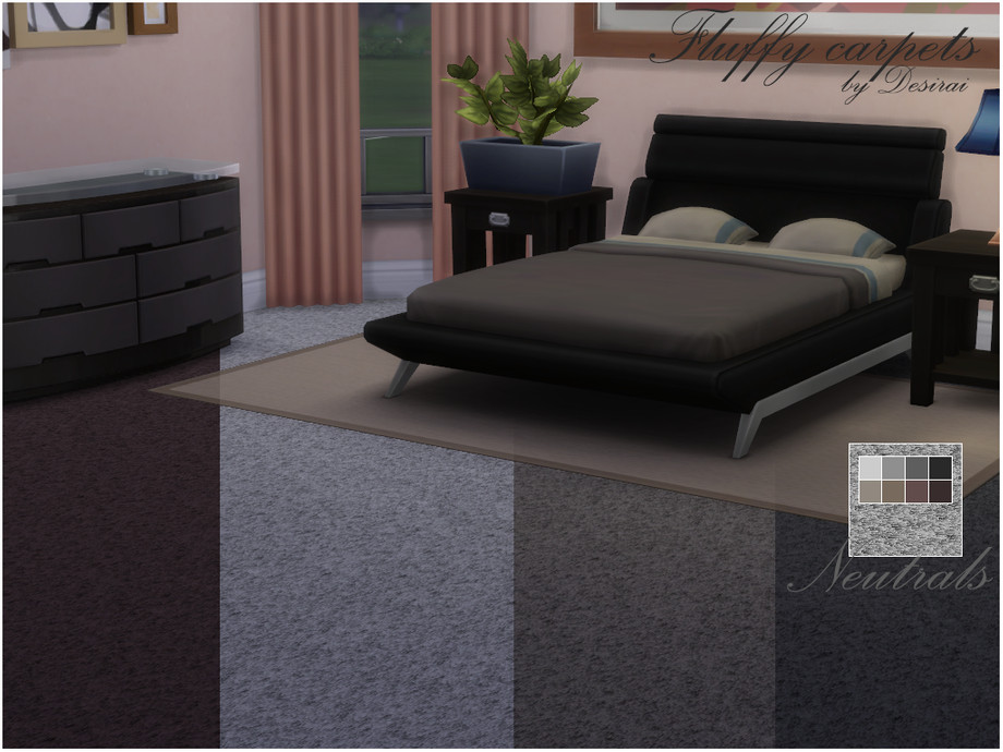 Fluffy carpets for your sims, this carpet is available in 8 swatches of neutral gray and brown.