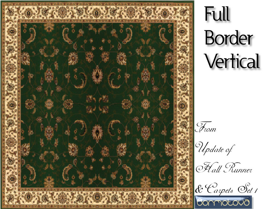 This is part 2 (vertically laid) of Update of Hall Runner and Carpets Set 1. I have broken this set in two, as it became quite large. This part has 11 carpets needed for creating a room border. Consists of vertical corners, side borders no border, full border and hall runner.