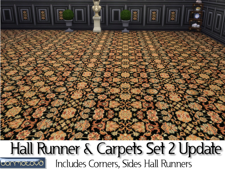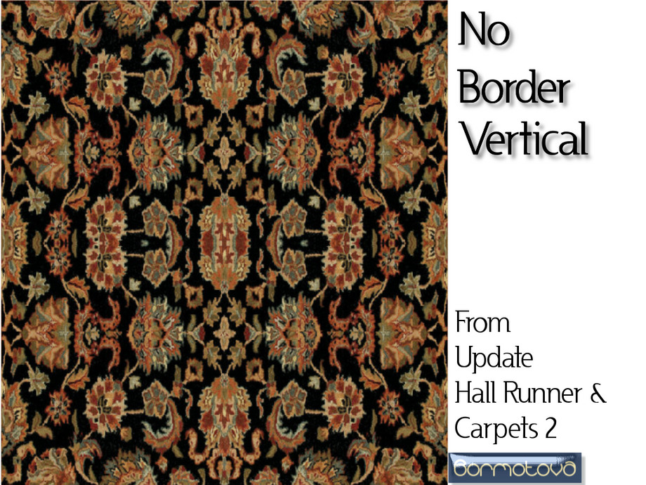 This is part 2 (vertically laid) of Update of Hall Runner and Carpets Set 1. I have broken this set in two, as it became quite large. This part has 11 carpets needed for creating a room border. Consists of corners, side borders no border, full border and hall runner.
