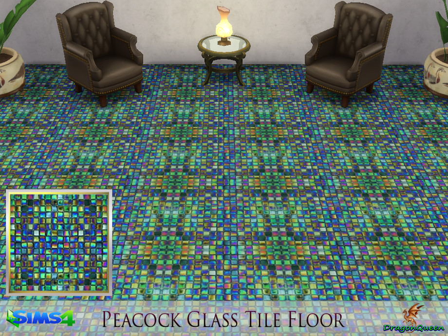 Small glass tile floor in shades of blue and green with highlights of purples and bronze.