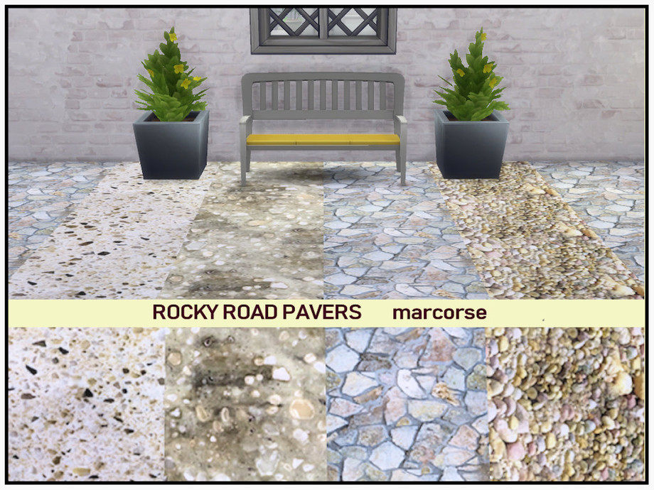 Four stone pavers for outdoor use, but may be utilised to give a rustic finish to enclosed areas. Features craay paving, river stones, embedded pebbles and a rough finish concrete. Found in both Stone/Outdoor. Created in the base game.