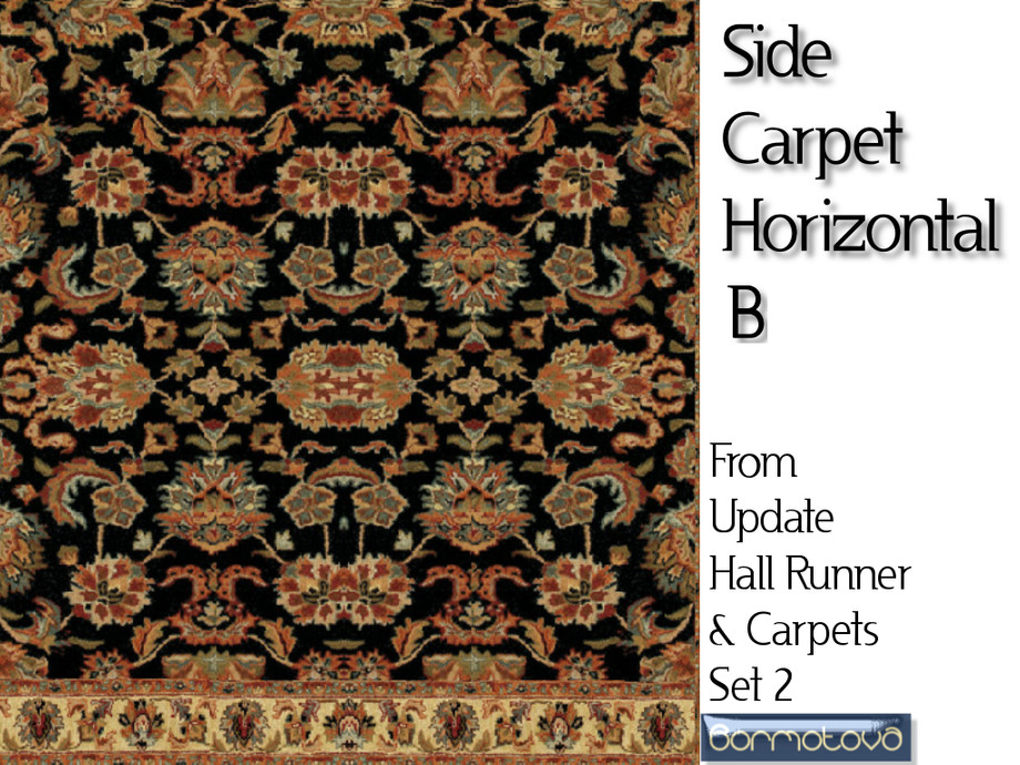 This is part 1 (horizontally laid) of Update of Hall Runner and Carpets Set 2. I have broken this set in two, as it became quite large. This part has 11 carpets needed for creating a room border. Consists of corners, side borders no border, full border and hall runner.