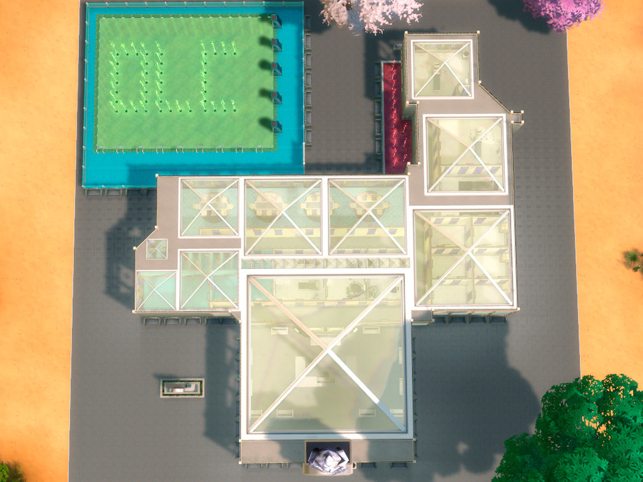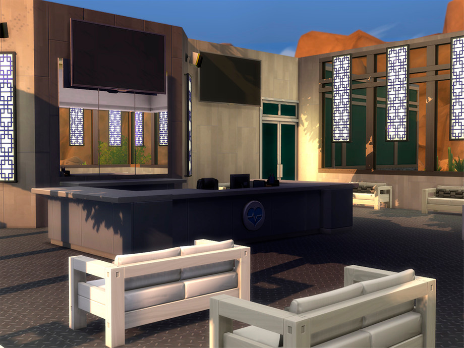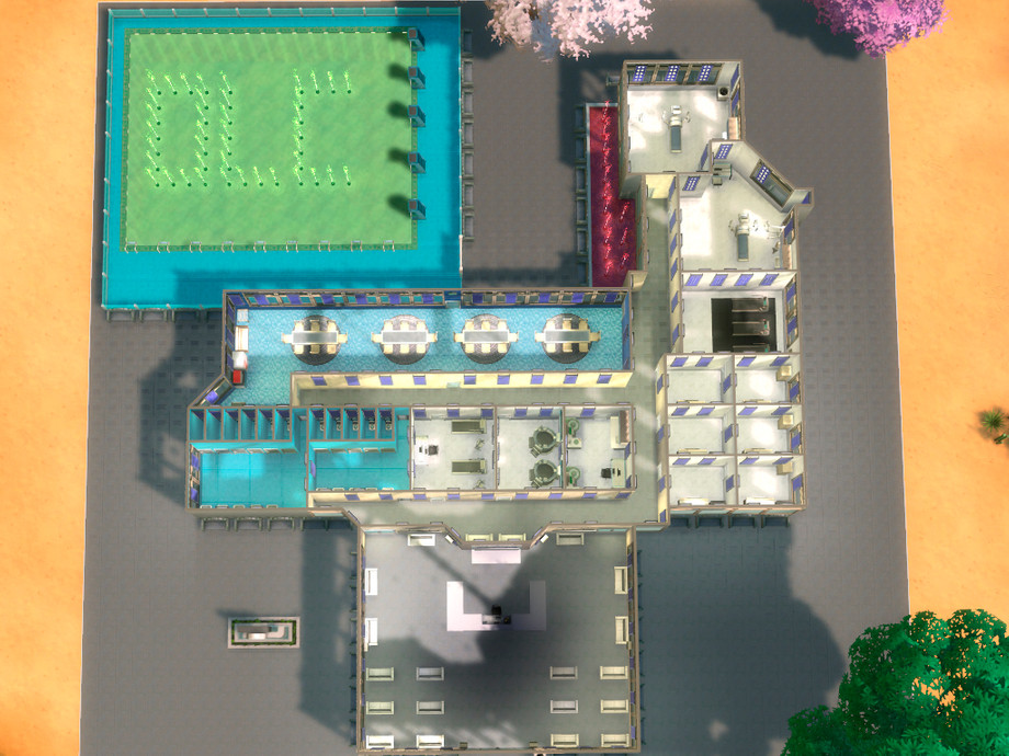 the testing rooms are smaller just enough to fit the equipment and the sims. there was an strange treadmills room, was downsized (not the medical equipment the regular treadmills, most likely a remnant of a beta version) the lounge for employees has been expanded for a common dinning room for pacients as well. in the end of the lot outside there is a gorgeous swimming pool with selvadorada imported water.