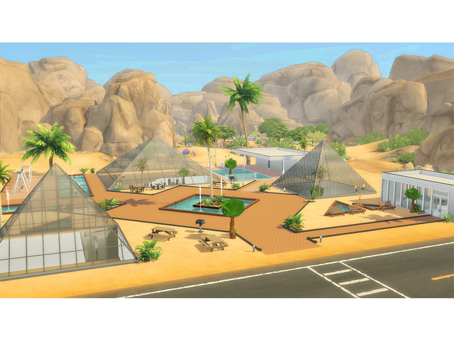 This Park is perfectly suit on the desert. There is a cultural space for residents at Under the transparent glass pyramidand and also there has a public swimming pool that is always open. I recommend placing this park in Oasis Springs. Because these three glass pyramids are the coolest when they are in the desert