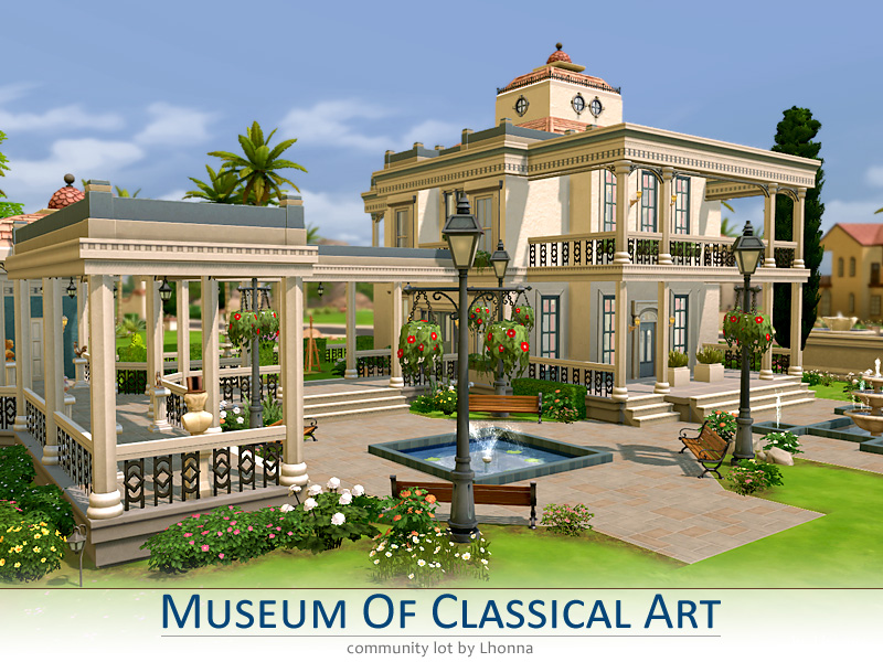 Museum Of Classical Art is a community lot for your artistic Sims. The architecture and the art pieces inside are very elegant and classic. In the garden there are huge arcades with sculpture masterpieces, few beautiful fountains and of course easels ready for being used.
