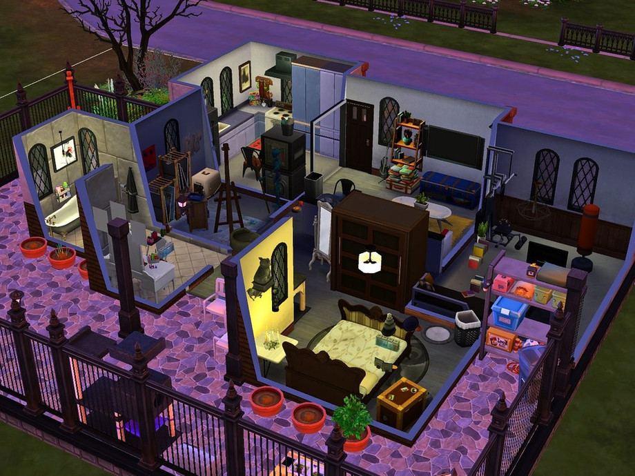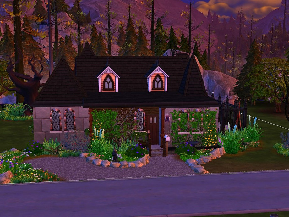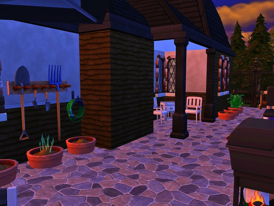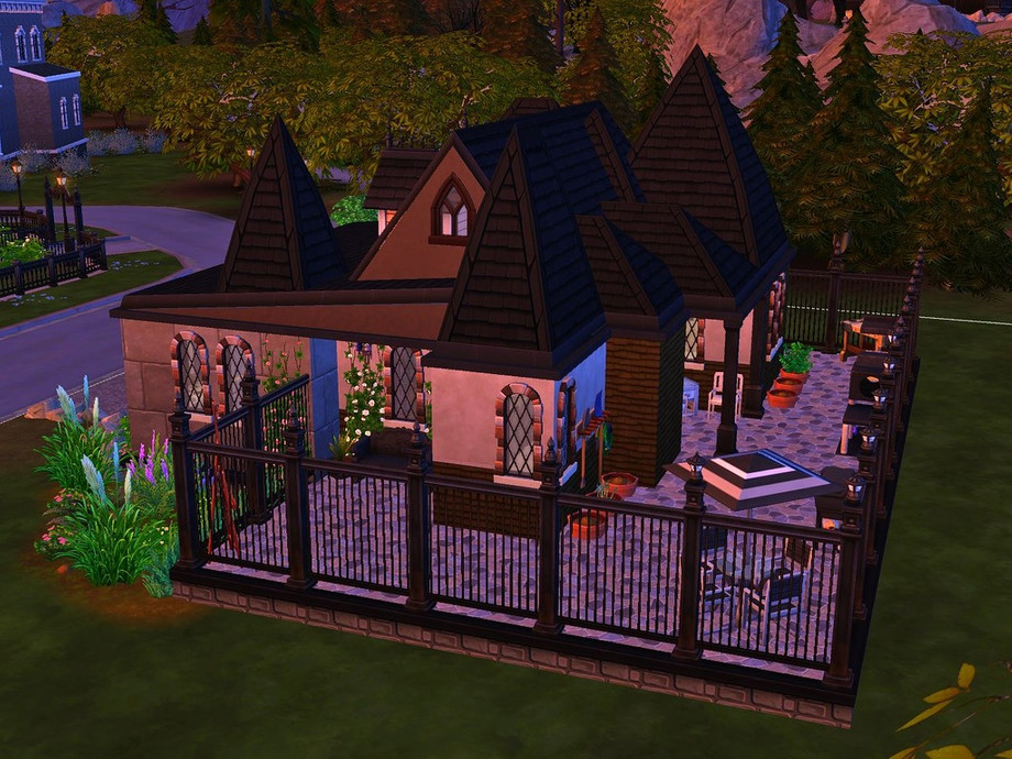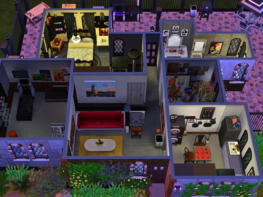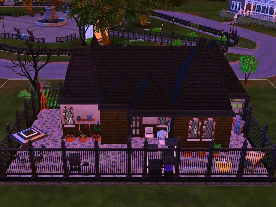 A perfect plot to call your final resting place. Don't build here if bats give you the creeps. Many make their home in a nearby cave. However, if you can look past that, you will find a nice quiet stone home equipped with a large bedroom, bathroom that includes a vanity and a modern-looking gym. There is a spacious fenced in patio with shade in case you're a creature of darkness and several easels situated throughout the lot. I've also included an area for gardening for those sims with a green thumb. This house caters to artists and those with a lot of creative energy.