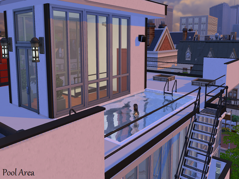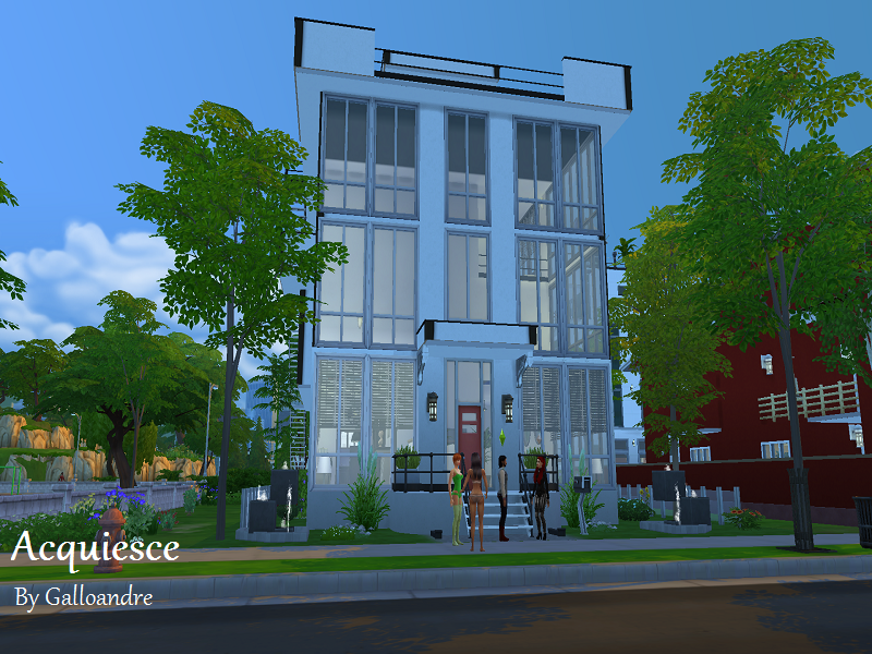 Acquiesce means to submit without complaint. Hence, when this beautiful home is submitted to your Sims, they'll certainly not complain! A huge, open front area inside greets any visitors in the sunken media/living room. There's a hobby room/gym/laundry room in the basement as well. There's a pool, eating area and garden on the rooftop. Get the laundry room items from My Sim World, and the rooftop observation telescope from Esmeralda at Mod the Sims. (See links under my notes) Enjoy!