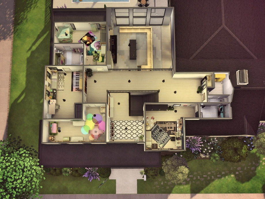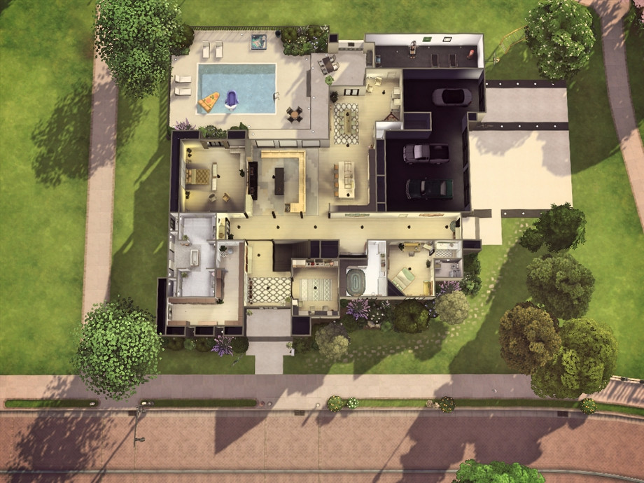 A big house for a big family. Downstairs is a huge master bd with a big bathroom and walk-in closet, laundry room, open kitchen and a huge living room area. An office, wet bar, gym and a dining area. Downstairs second bedroom i figured would be for a really artsy sim that's in the uni but still lives with the parents. Upstairs there's two twin bedrooms with a shared bathroom and the blue bedroom upstairs is for like a really smart sim that's really into IT and stuff. I hope you like.
