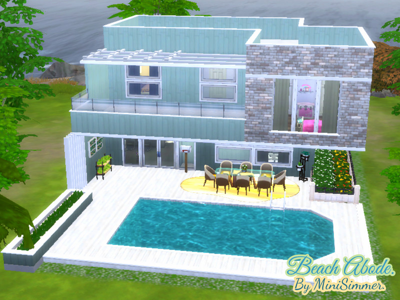 Beach Abode is a Coastal home with a modern touch featuring 2 Bedrooms and 3 Bathrooms. On the front of the house there is a pool and a outdoorsy Dining area. On the inside is a Black and white Kitchen, An area for your pets , Living room, Study room, bedrooms and Bathrooms. There is also a small balcony on the Back side of the house.