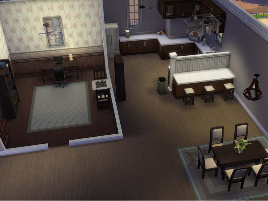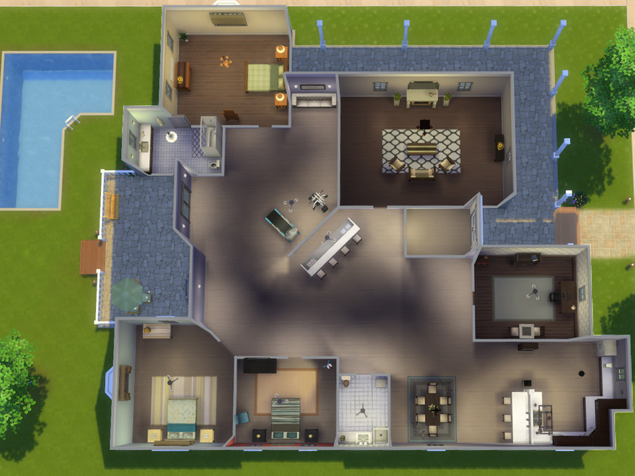 A medium-sized family house, with 3 bedrooms, 2 baths, an open-concept kitchen and dining room, a study room, gym, and a bar.