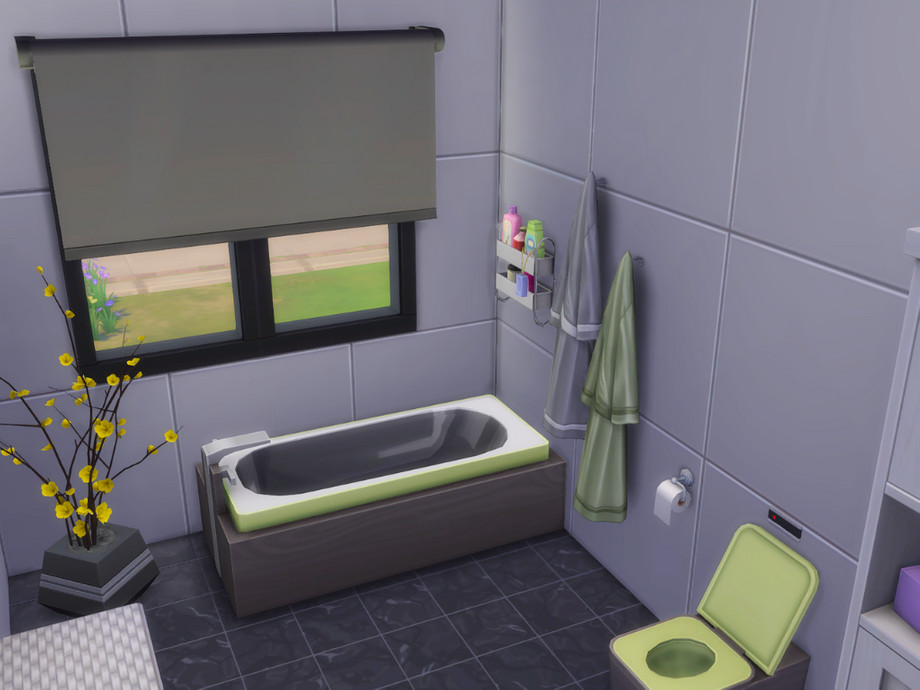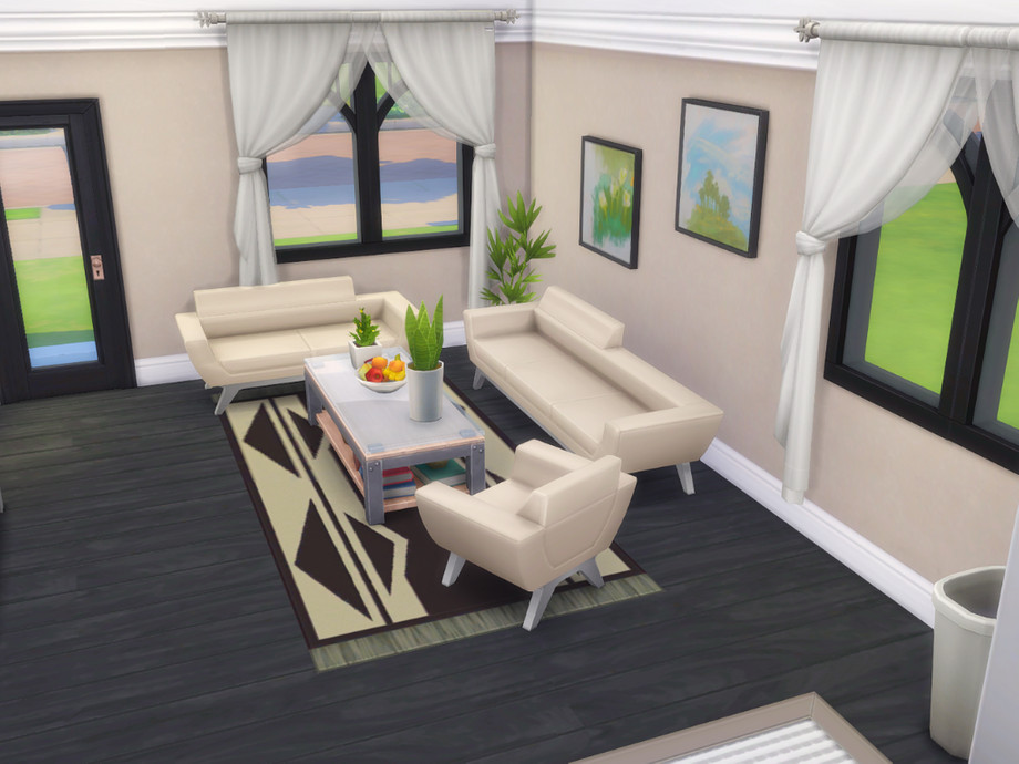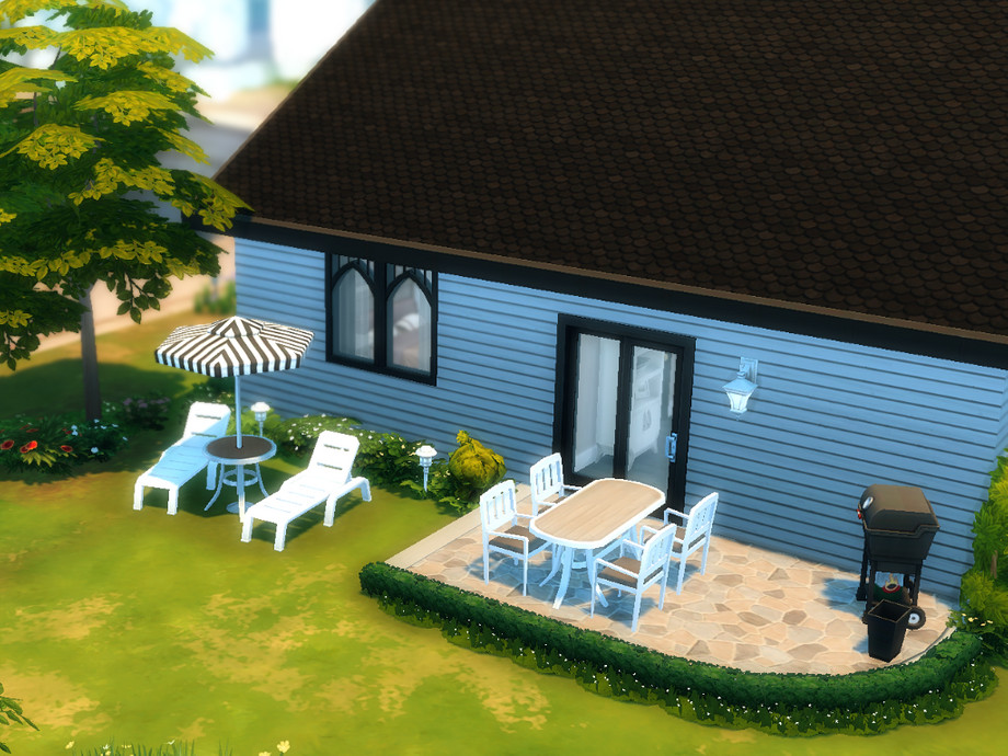 A modern house for 1-4 sims! The house has a lovely BBQ area, 2 bedrooms, 1 bathroom and a 2-in-1 kitchen and livingroom!