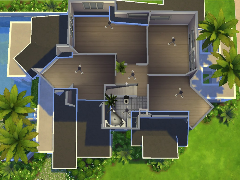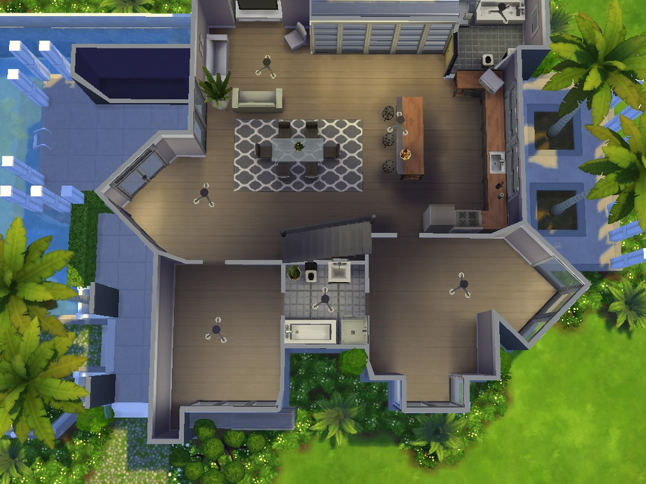 This stylish modern home is great for any sim family. It features six bedrooms, three bathrooms, a pool and plenty of outdoor living space. Partly furnished, no CC required.