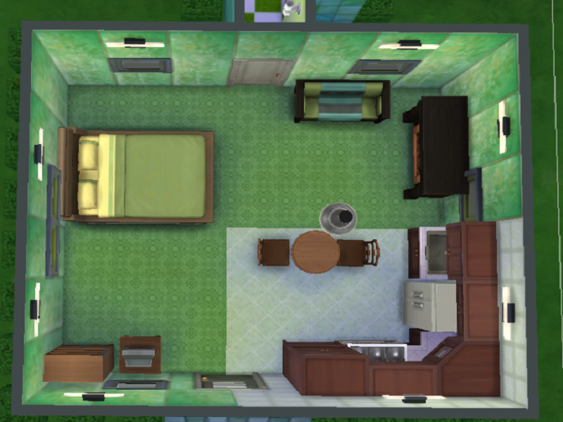 A small one room, one bed, one bathroom home in the middle of woods. It's green outside blends into the forest making while it's interior offers comfort and relaxation. Your sims will feel a million miles from civilization in this little home only a short distance from the rest of the neighborhood. Just enough room for a single sim or a new couple.