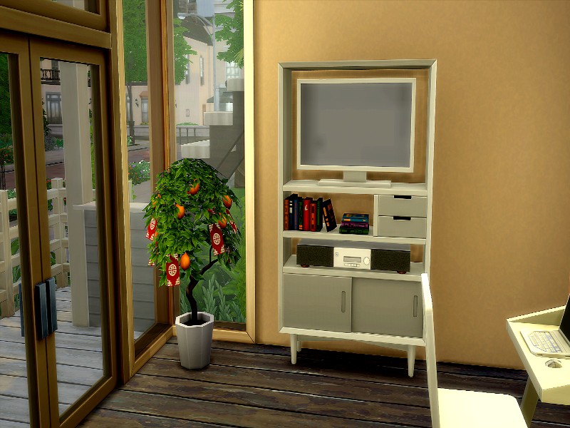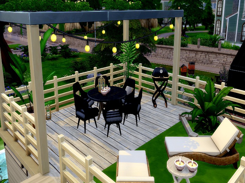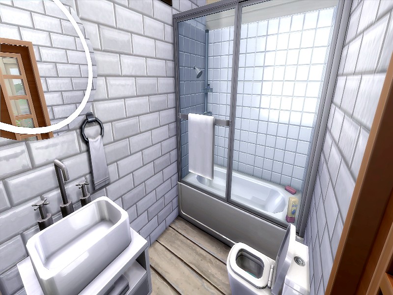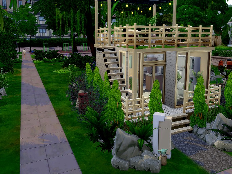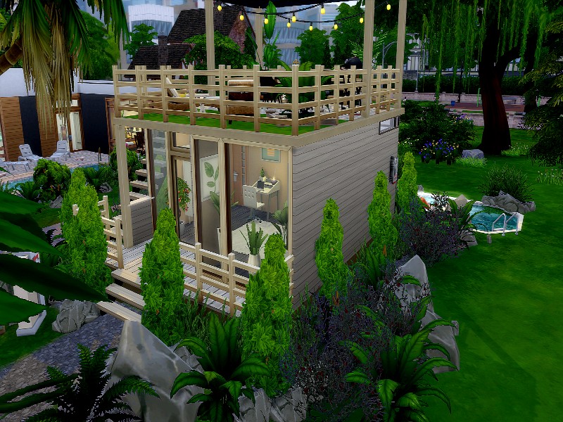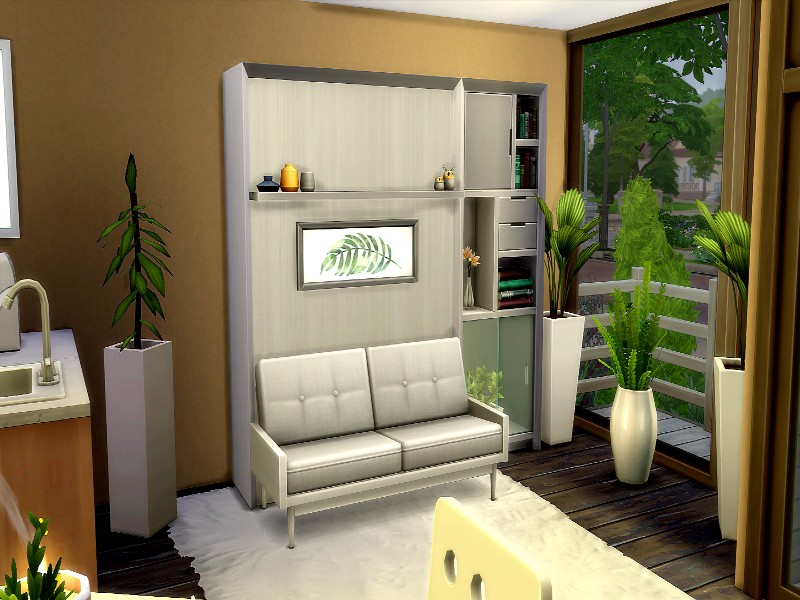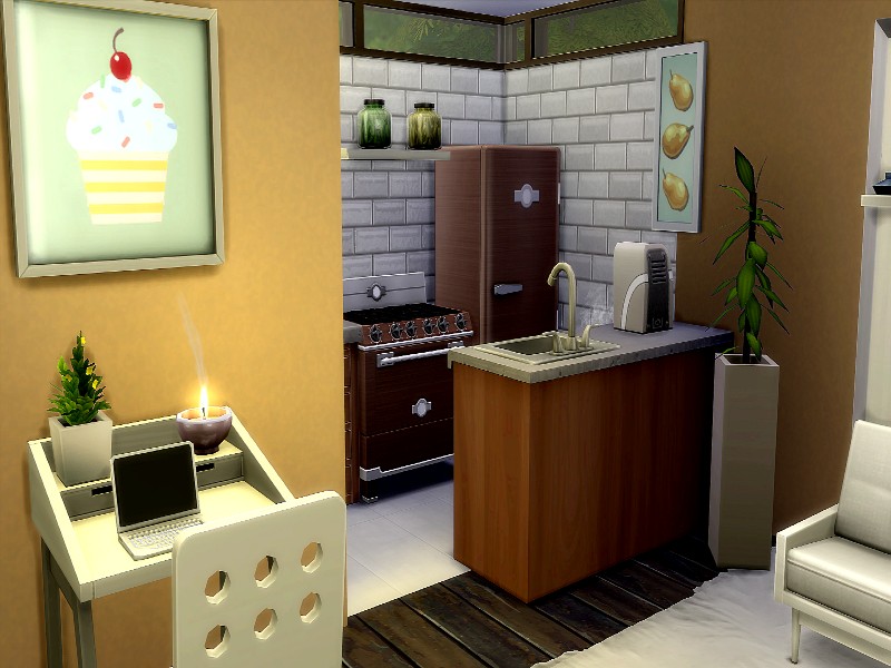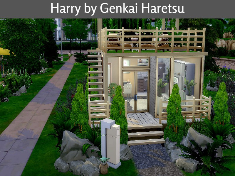 Harry is another tiny living house for one or two sims. This time no separate bedroom, withen and livingroom are together with bedroom. Dining spot on the roof.