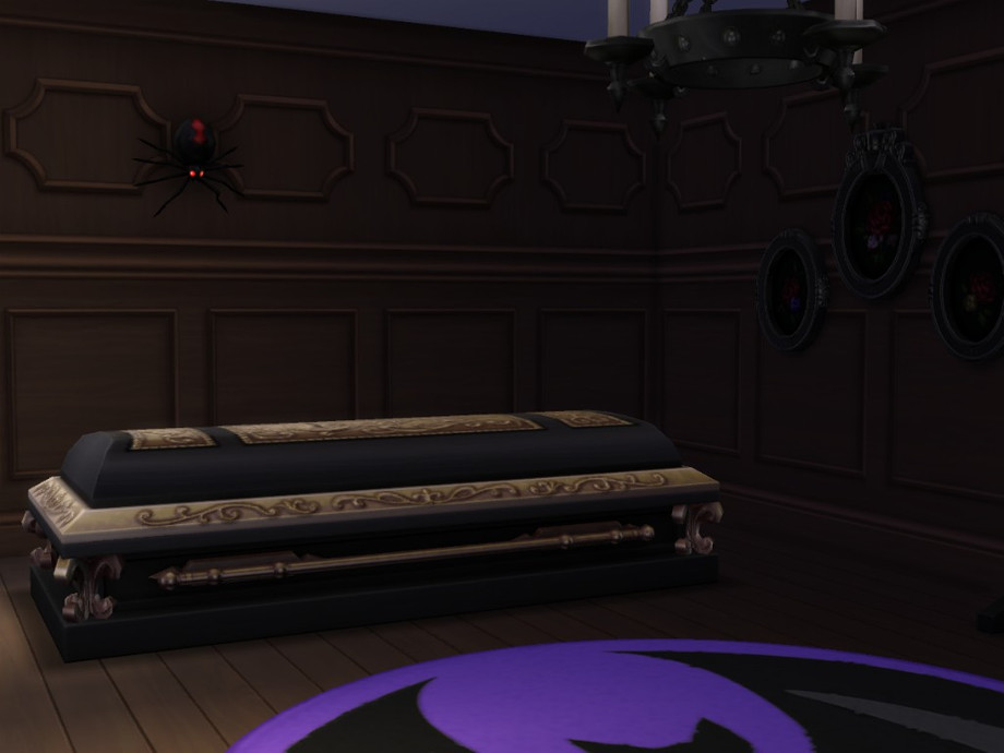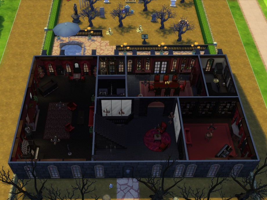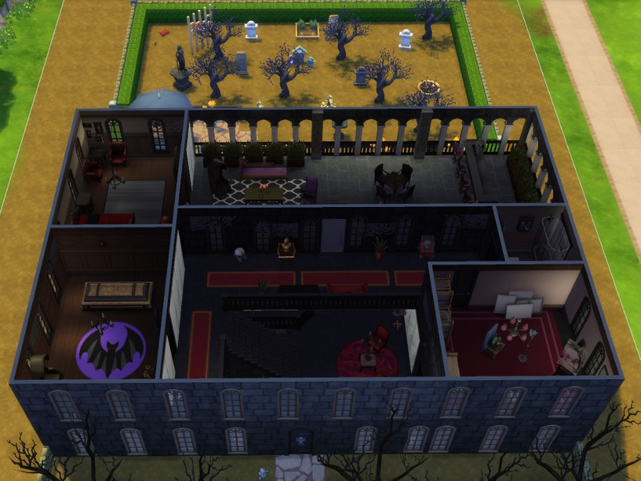 If you aren't afraid of a few ghost visitors, this could be a perfct house for your family! It has 2 bedrooms and 2 bathrooms and an outside living room, your vampire sims will also be happy to find a coffin and a plasma fruit garden in the back, and your more active sims can take advantage of the gym in the basement.