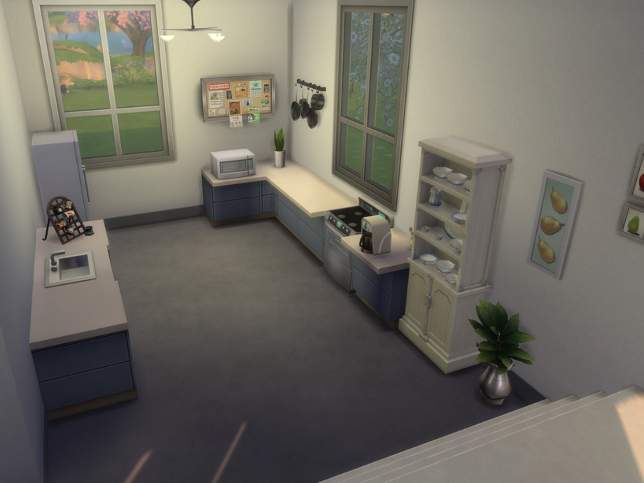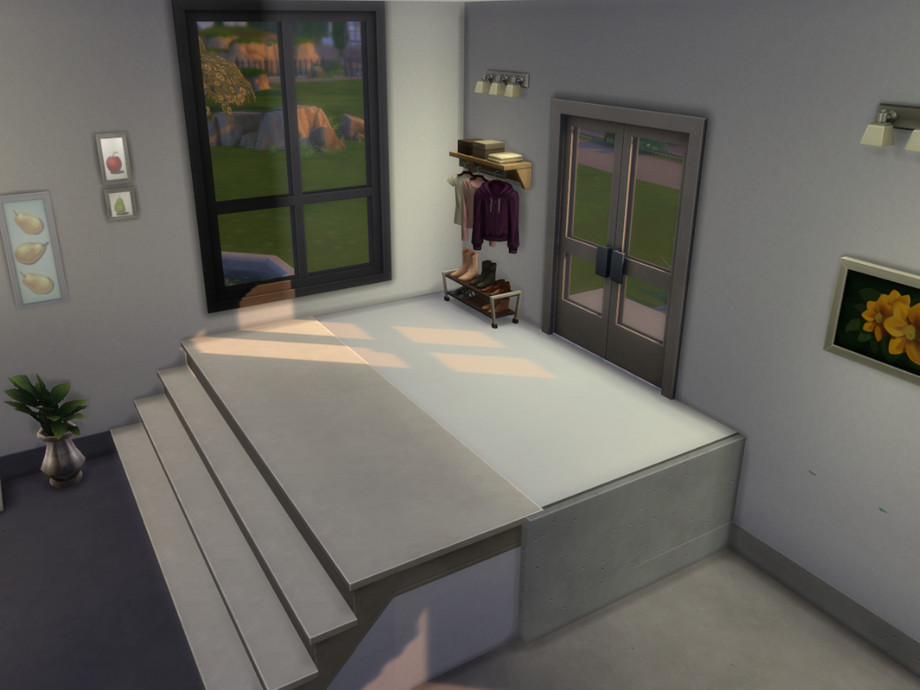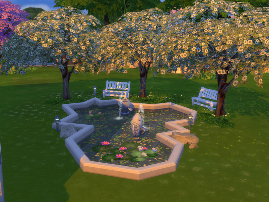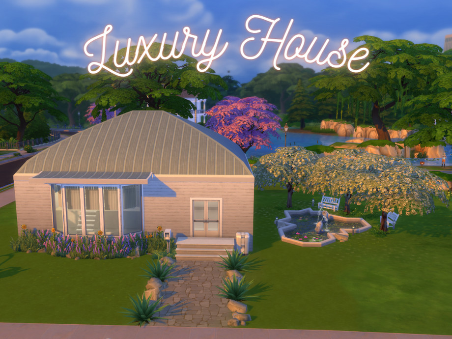 A spacious one floor house with one bedroom, one bathroom, one kitchen, perfect for a single sim. In the yard you can find an abstract shaped fountain surrounded by trees, with benches around it.