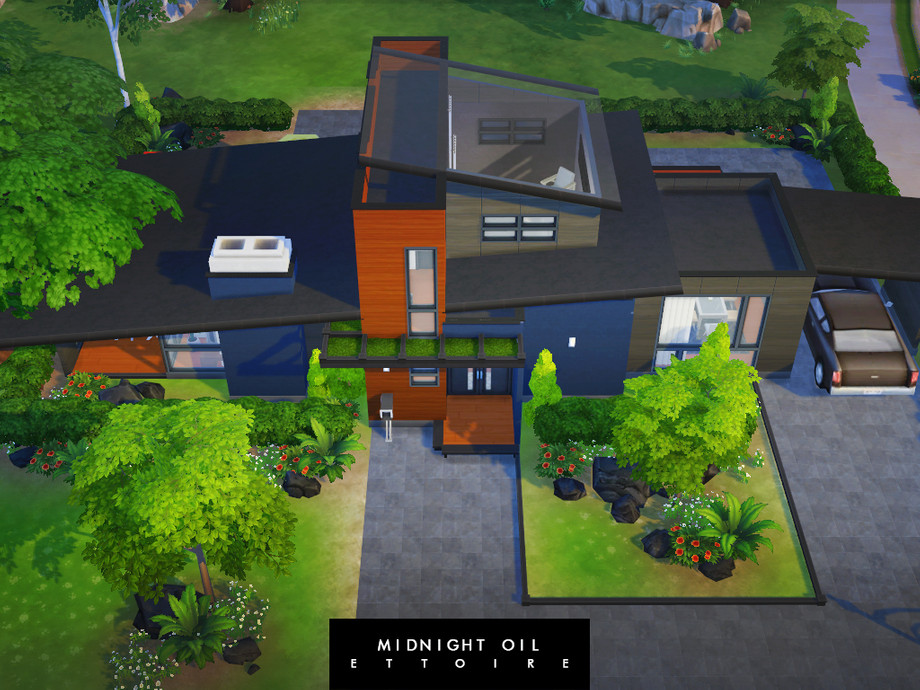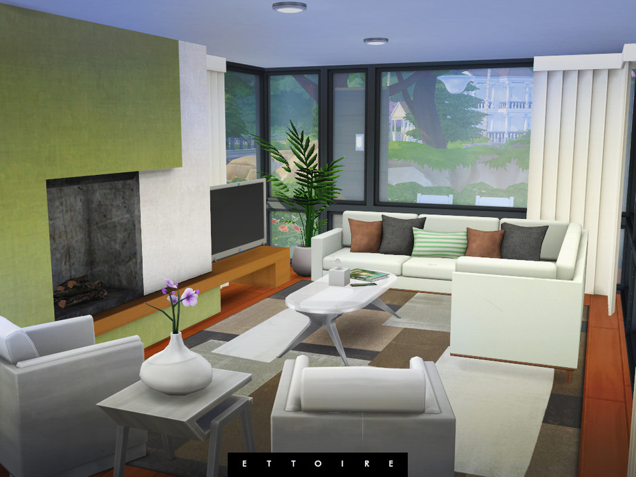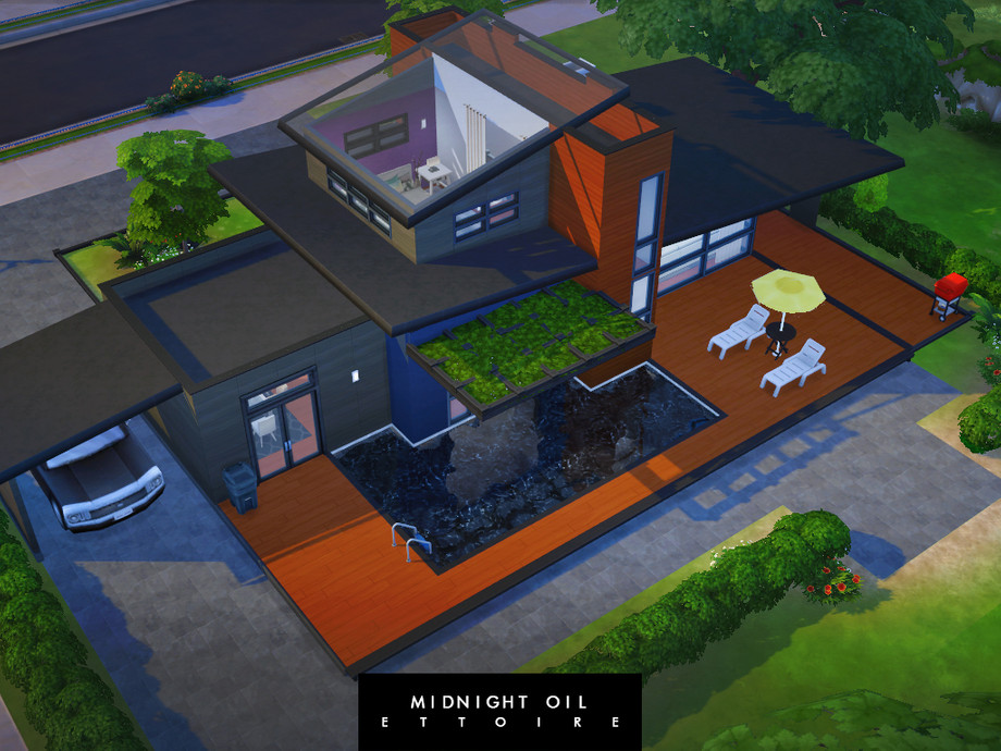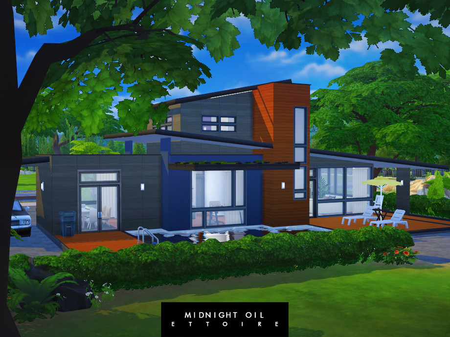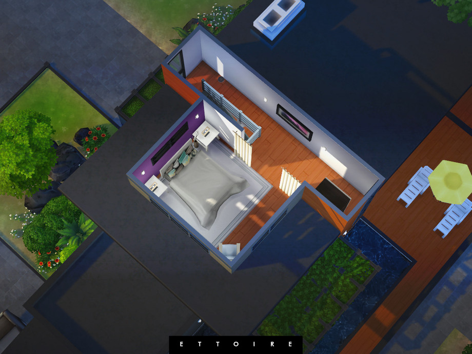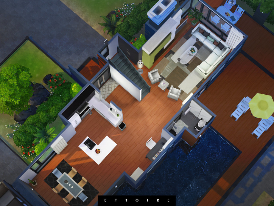 Modern, minimal, two story bachelor pad for your sims. Backyard has a small pool, lounge chairs and a secluded dining area with a BBQ.