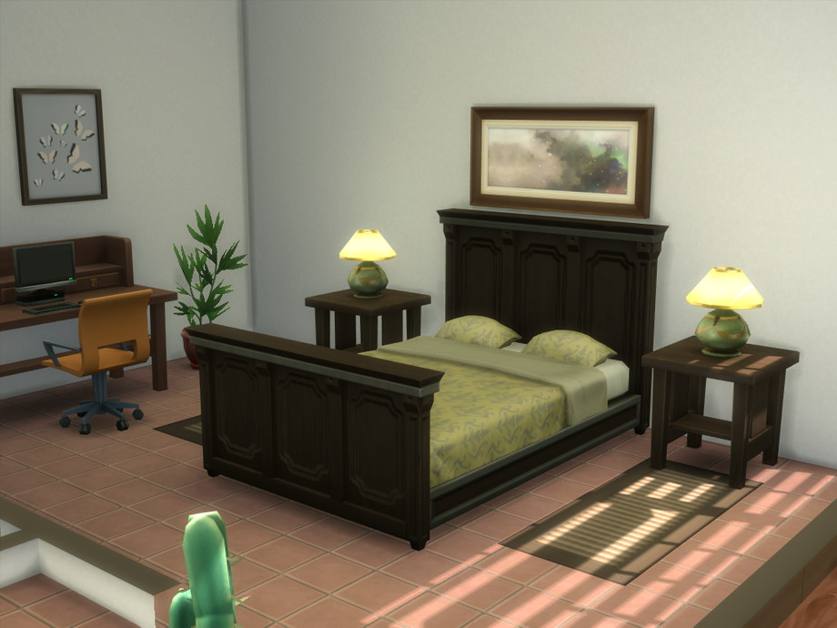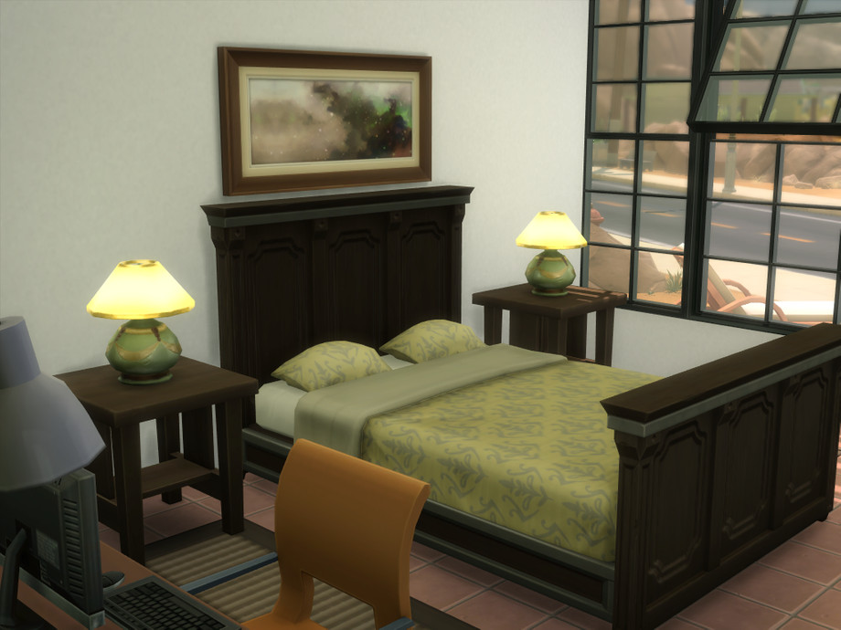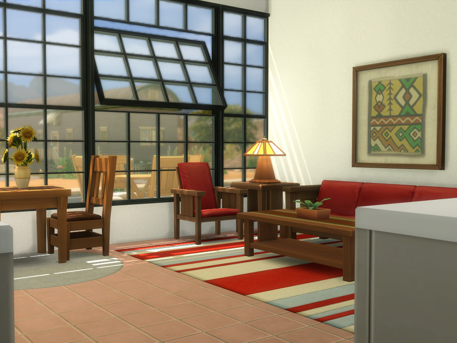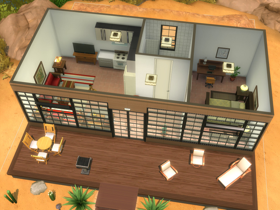Bask in the sunshine and beauty of the desert! Charming modern one bedroom, one bath starter home is sure to please your most discerning Sim. Open floor plan living room, dining area and kitchenette plus a separate bedroom and bath. A full wall of windows and full length deck makes for easy viewing of the desert landscape and alien sightings! Custom content only used for windows and doors, everything else is Maxis made.