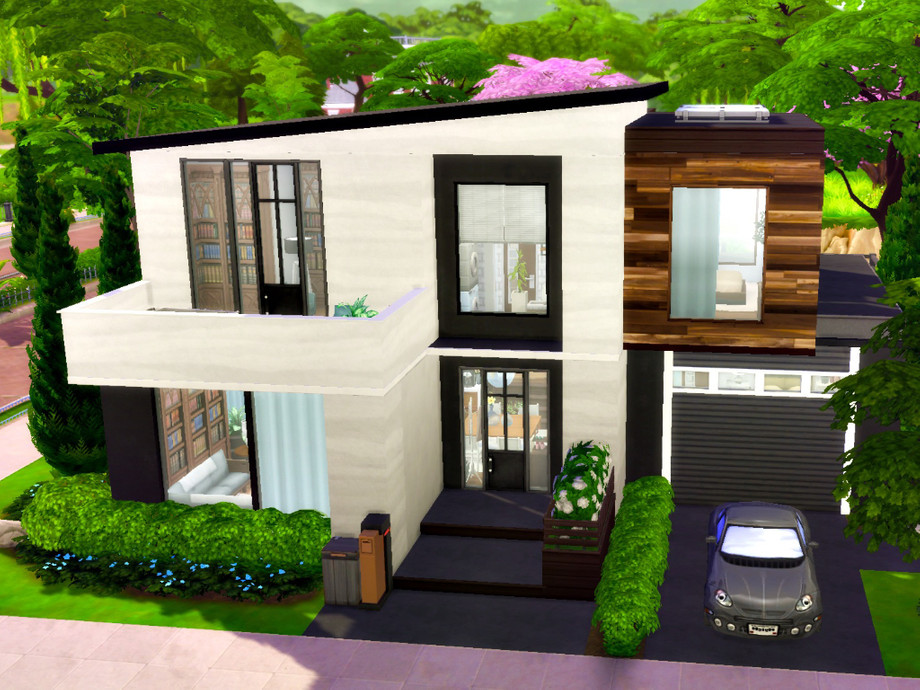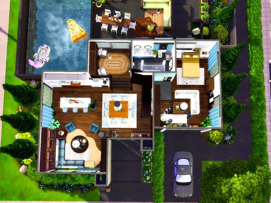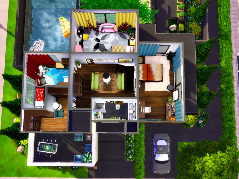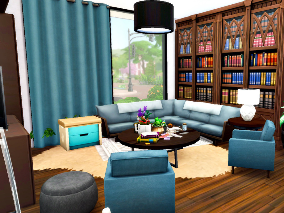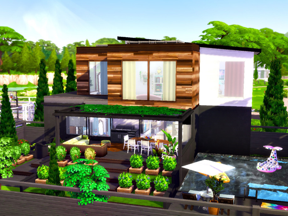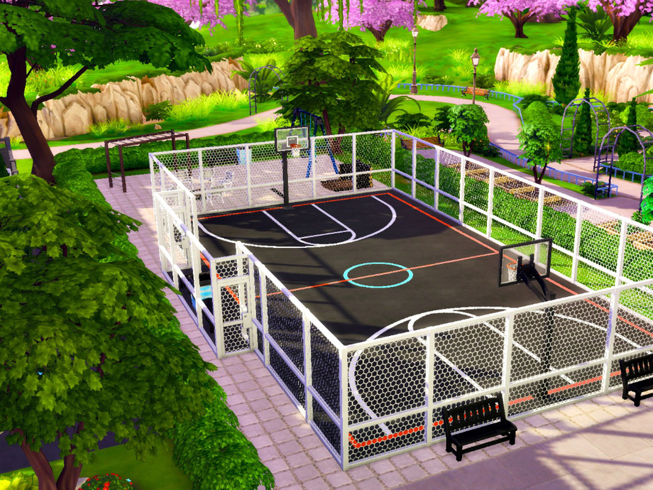 A big and modern home for up to 7 sims, specifically big families of multiple generations. As a part of the lot comes a community basketball court and playground!