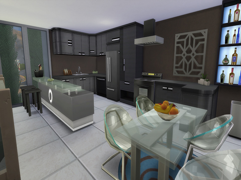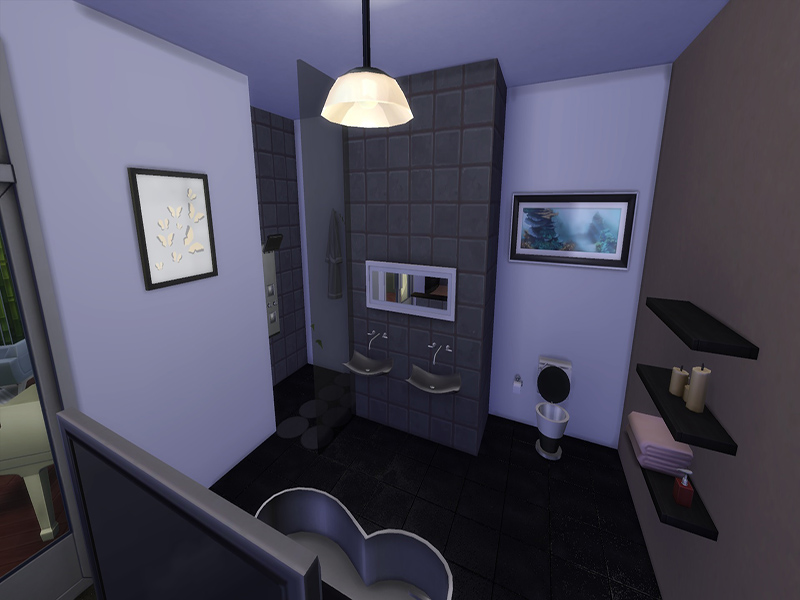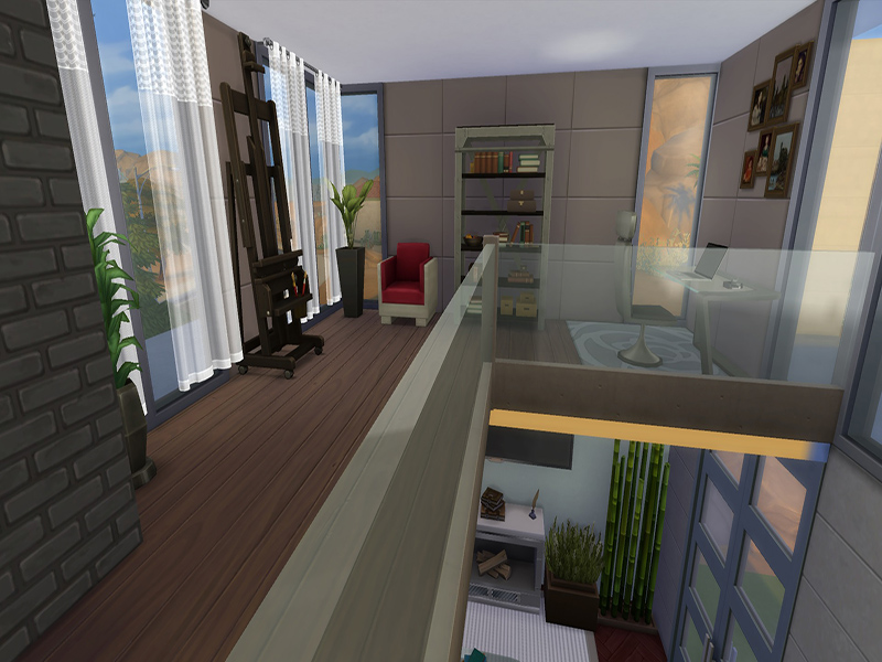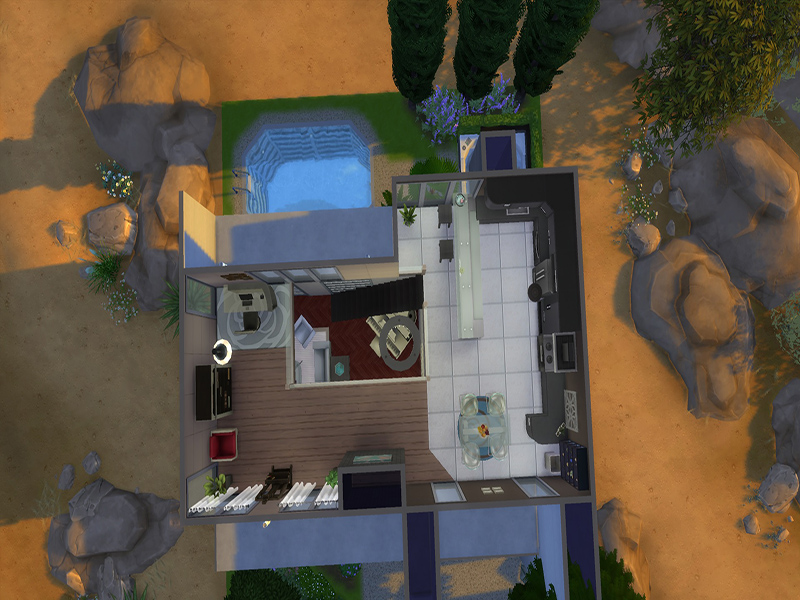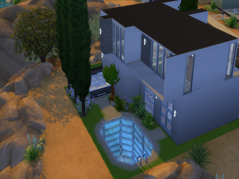 It's a lovely house for a couple of sims, cause it has only one bedroom and one bathroom. It also has a kitchen with a bar, a living room and a working area for your sims ! It's a house for the sims who loves art. The garden is hidden with a lot of plants, and ur sims can get relaxed in the hot tub or in the pool !
