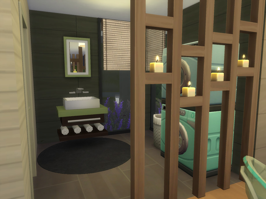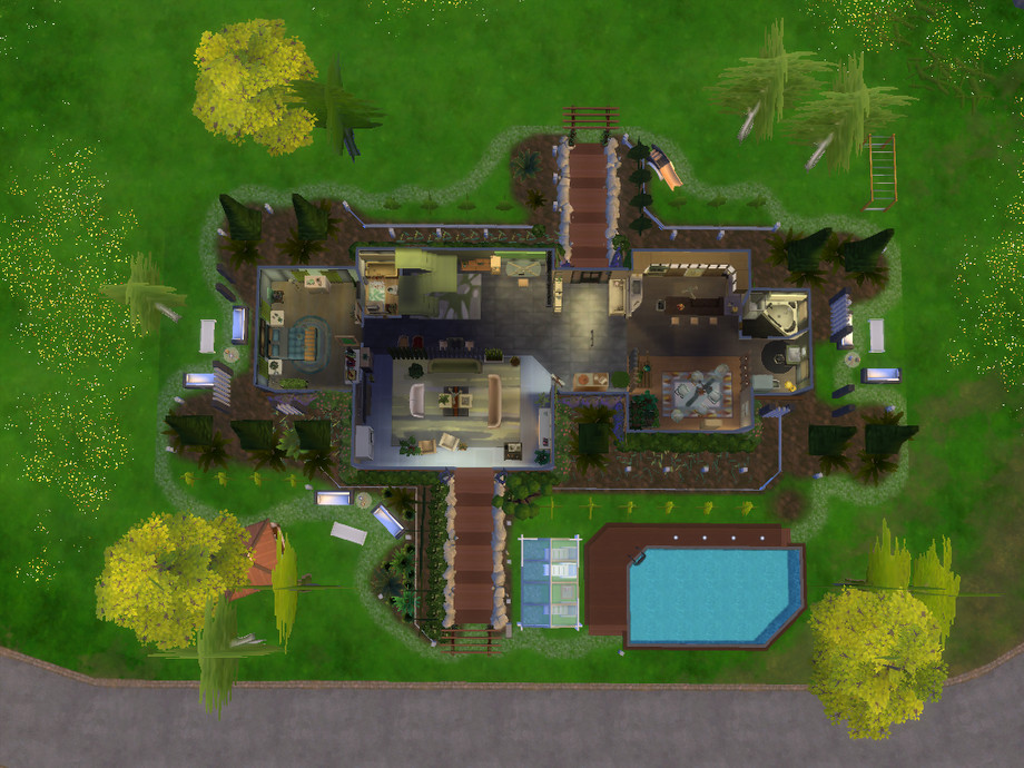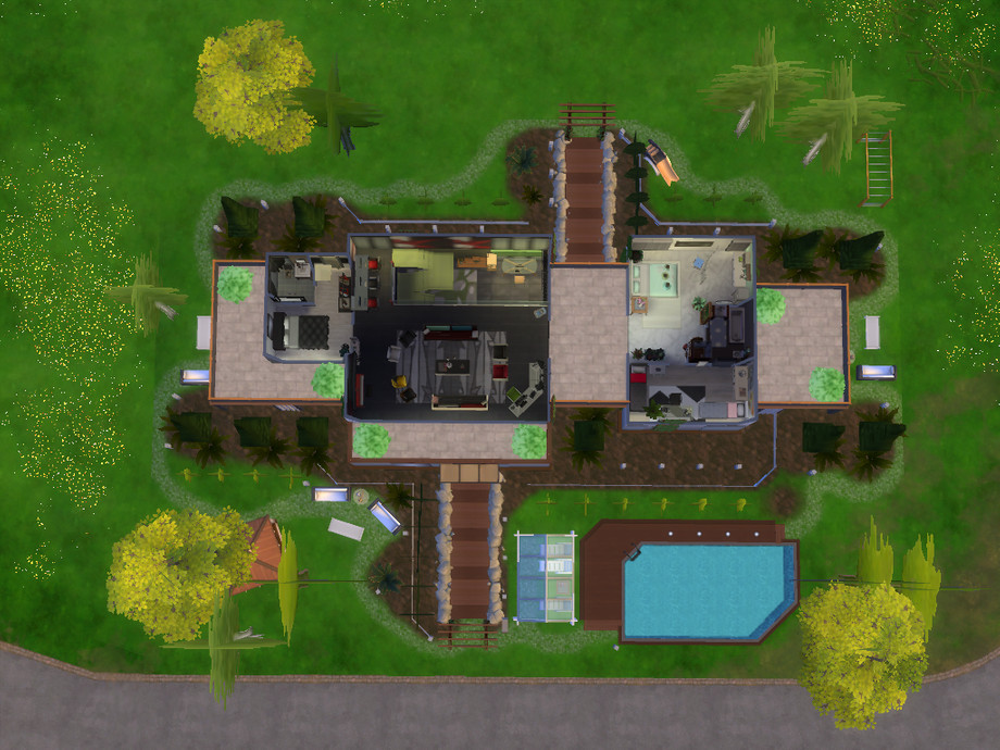 Downstair has a spacious living area, an semi-open kitchen and a dining area, a laundry area and a guest bathroom, along with a bedroom and an ensuite bathroom. Upstairs has a common entertainment area, a separate bedroom with an ensuite bathroom, and two bedrooms (one for two children/teens and one master) sharing an ensuite bathroom. Terrain paint pavement surrounding the lot, as well as a few outdoor living/seating areas - including a pool and some lounge for sunbathing.