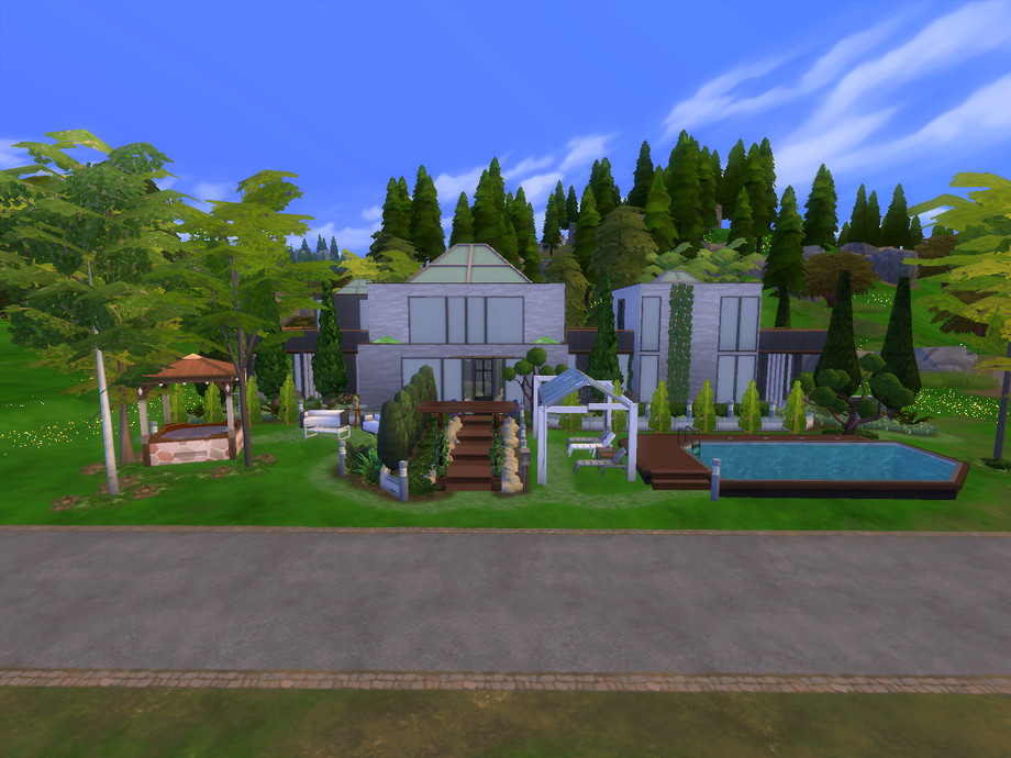 A modern build on a 40x30 lot. Recommended placement:The Summer Home lot in WIndenburg, because the exterior and landscaping matches the surrounding world of that lot.