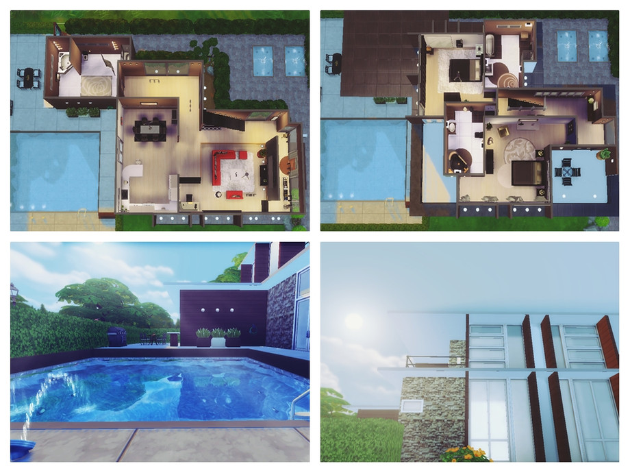 A modern house with a pool, for a small family. On the first floor is a living room, kitchen, dining room and one bathroom. The second floor has two bedrooms and two bathrooms.