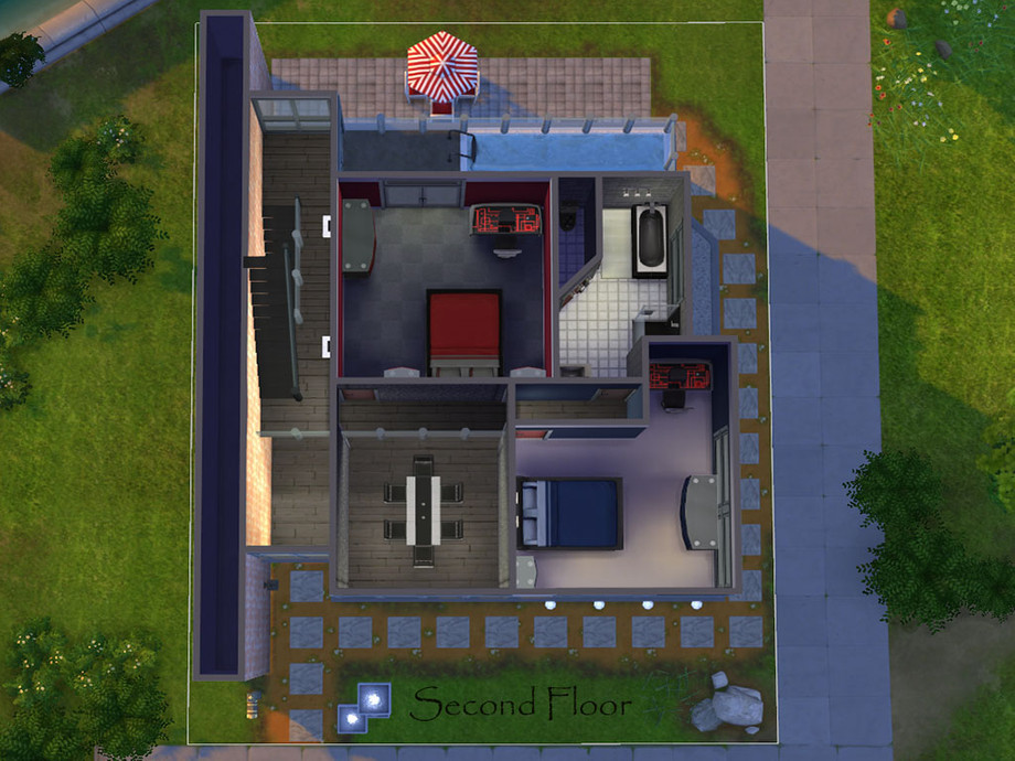 Open plan spaces for kitchen, dining and living rooms, with a half bathroom off the hallway. The Kitchen has a view to the underside of the pool through windows (unfortunately you cannot see swimming sims through the windows, but I still thought that it looked cool). The far-end of the hallway leads to a paved Barbeque area.