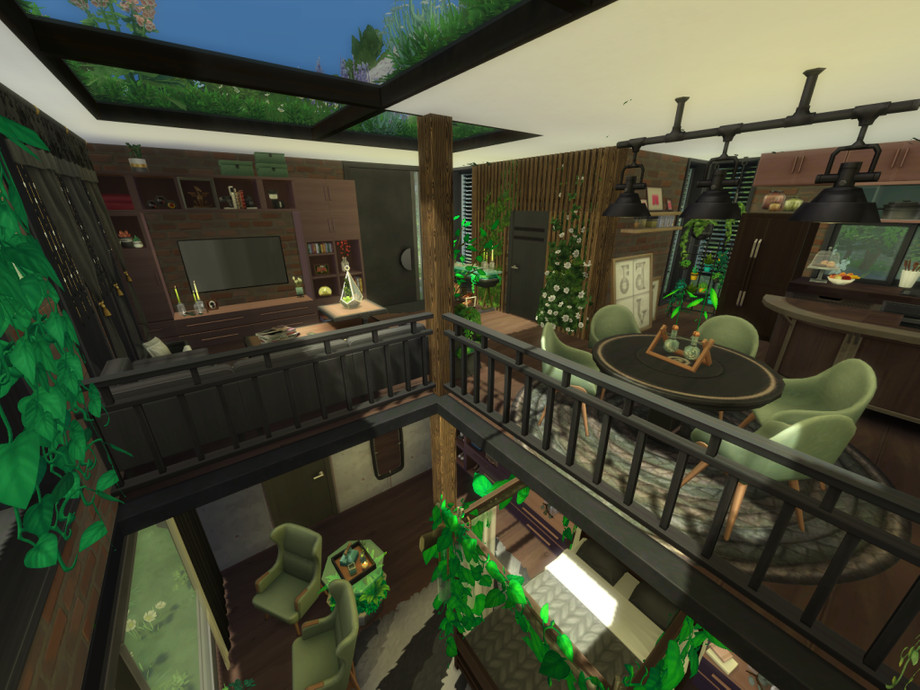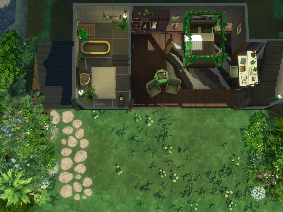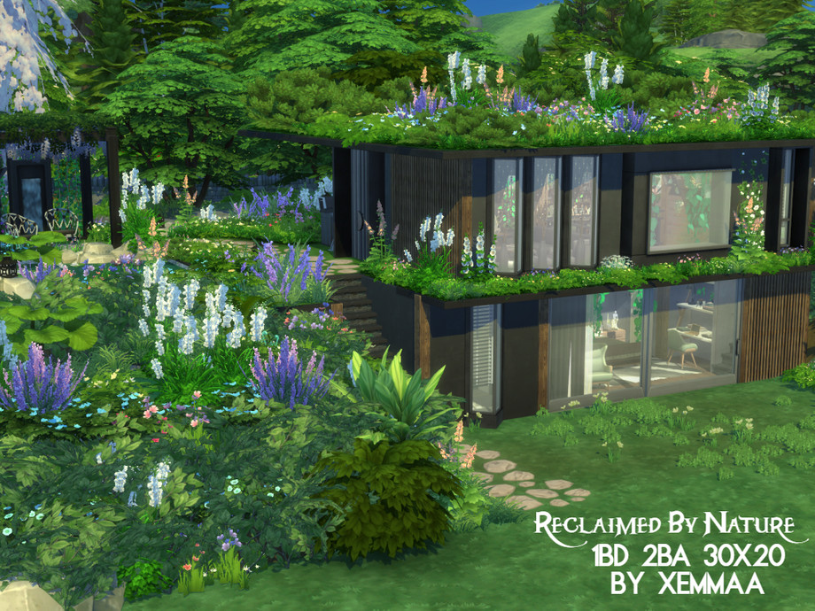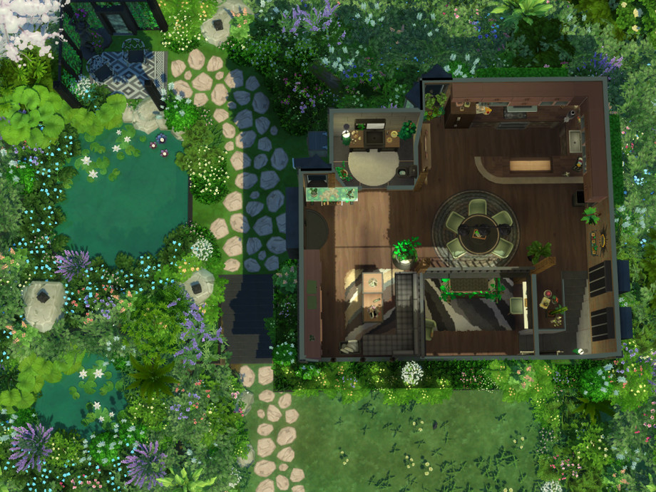 A modern house reclaimed by nature, featuring a swimming pond and lots of plants!