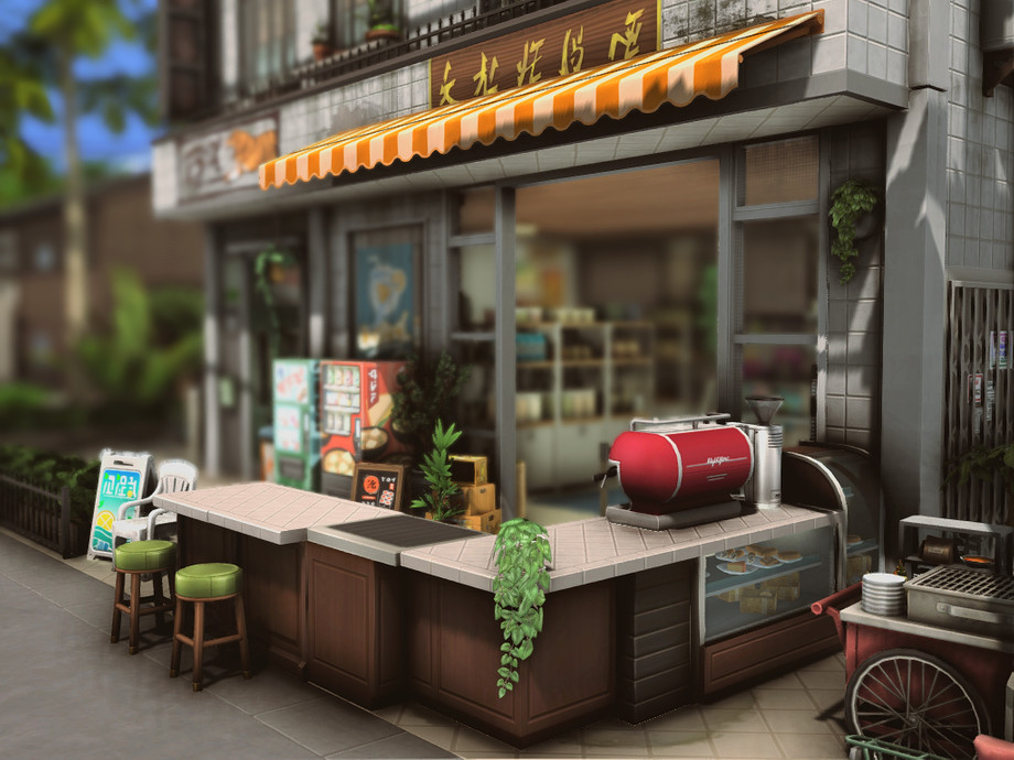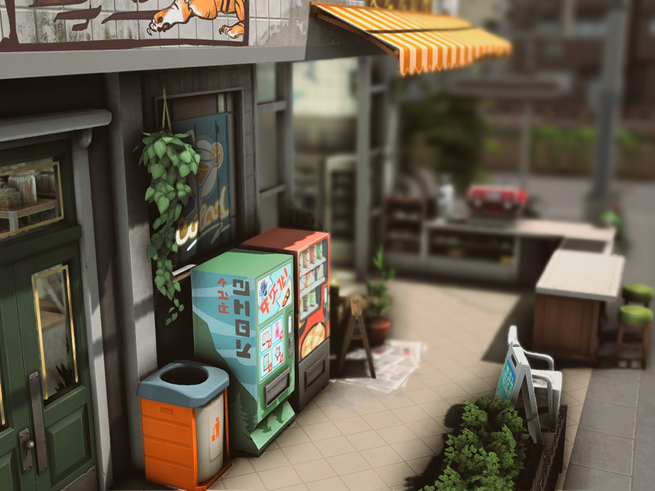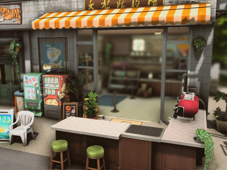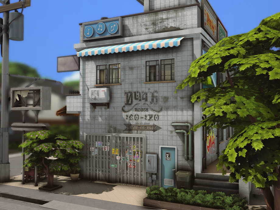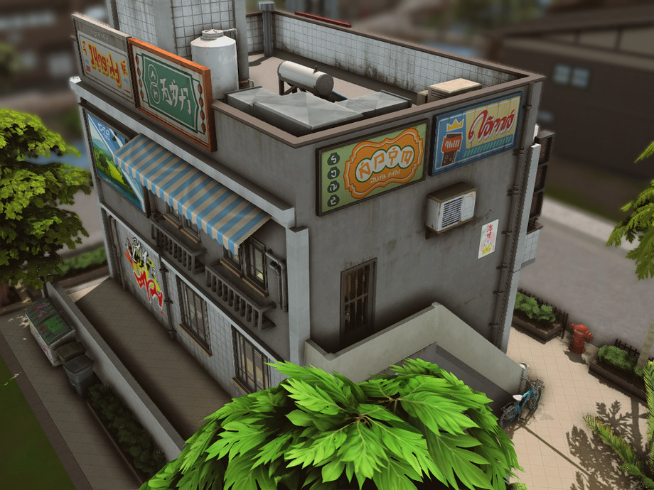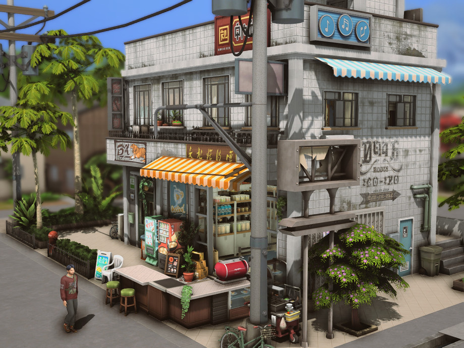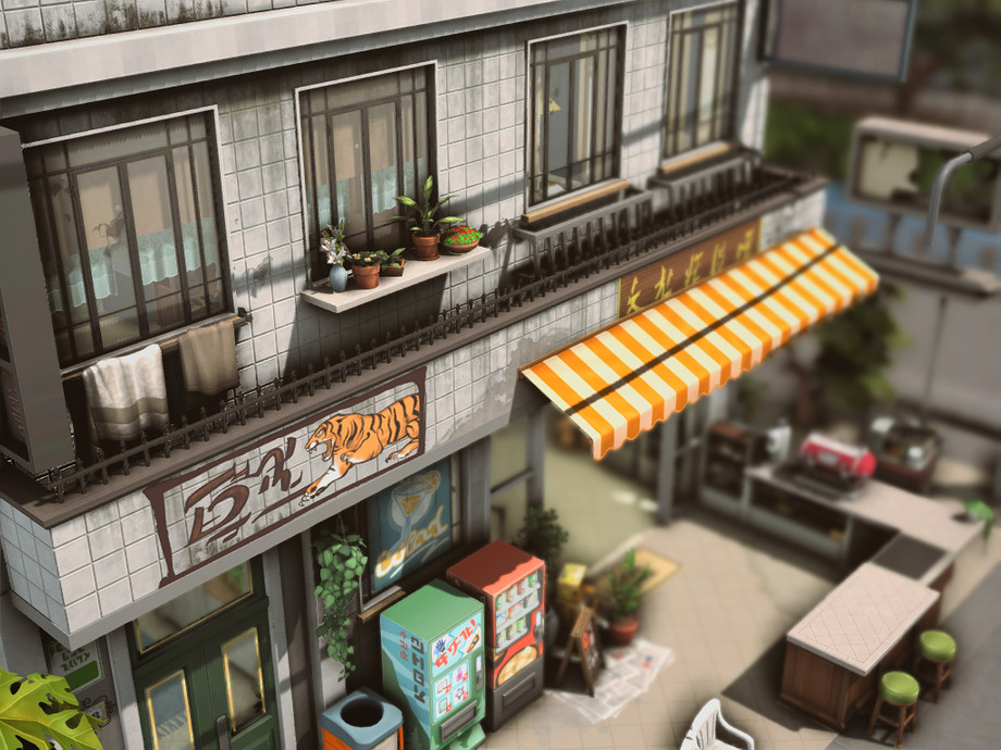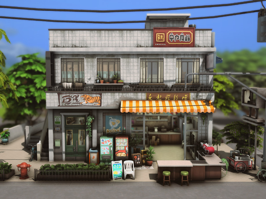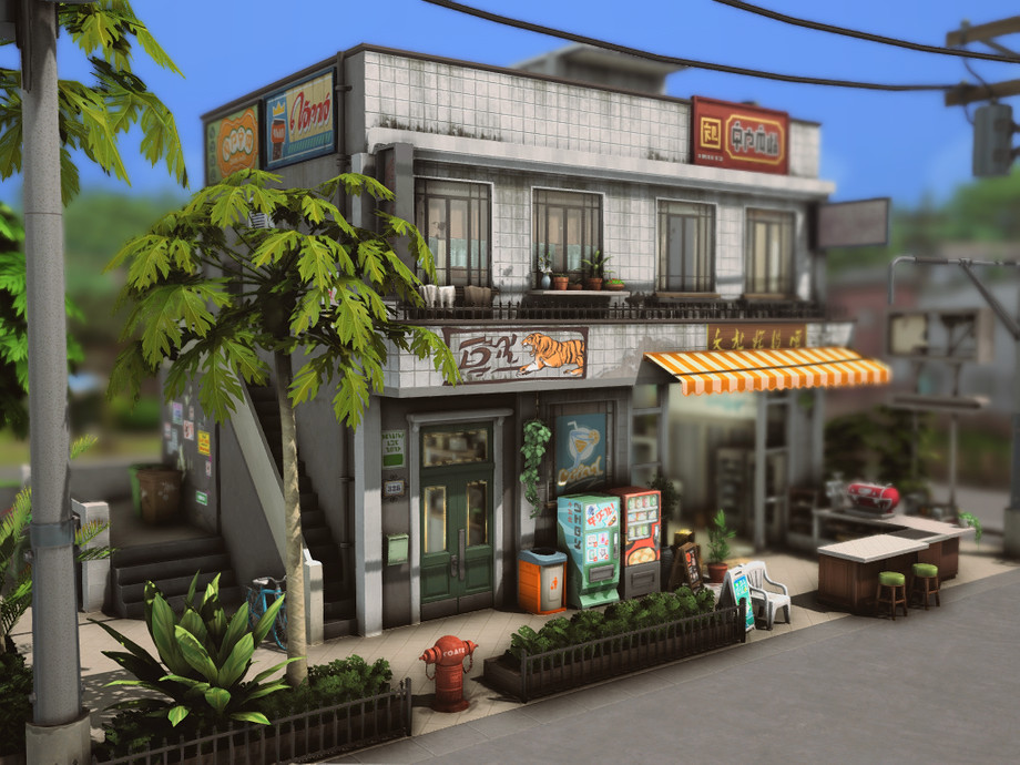 On a quiet corner of the city stands this small two-story building. On the ground floor, there's a bustling convenience store, always brightly lit and open late, serving the neighborhood residents. The aroma of fresh coffee mixes with the sound of quick conversations and the ringing of the cash register. Above, on the upper floor, there's a cozy residence with windows that overlook the street.