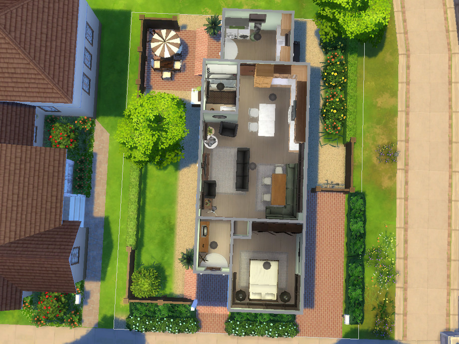 Riley is the perfect starter home for an enthousiastic single sim or a lovely couple. The house has a master bedroom, an open plan living, dining and kitchen area, a bathroom and a laundry/mudroom. Outside is a cosy terrace.