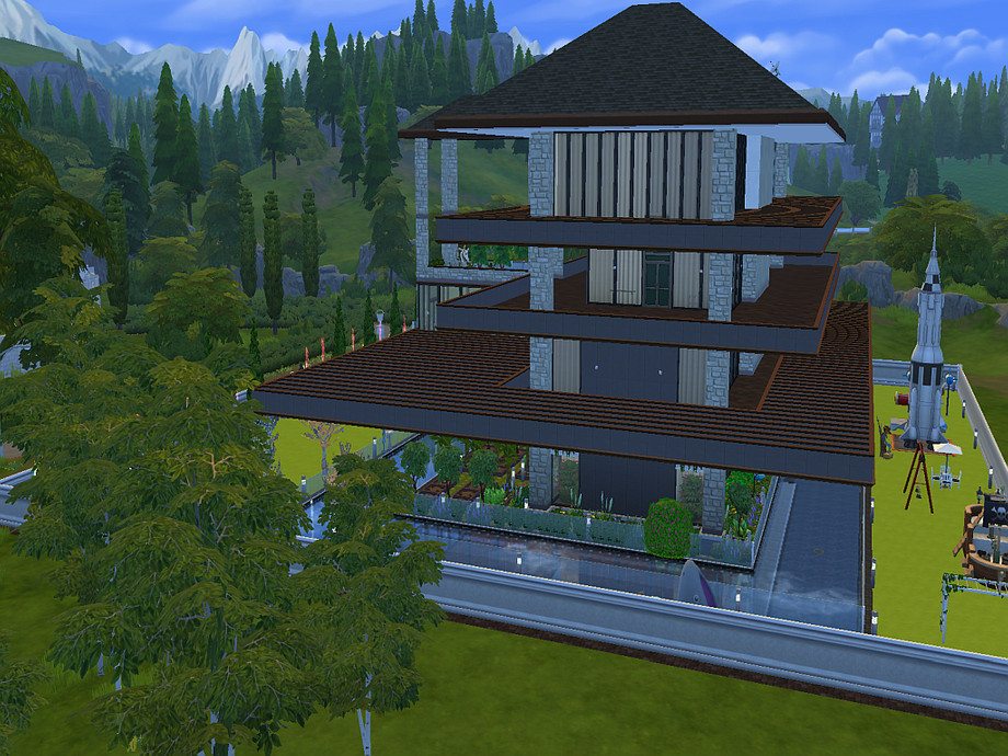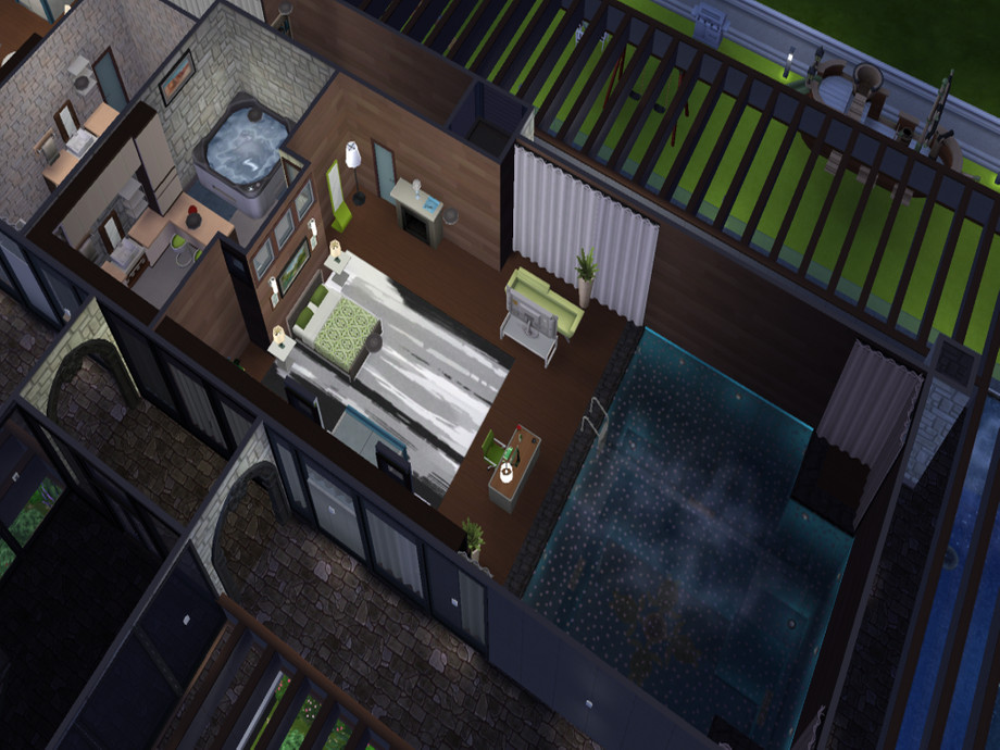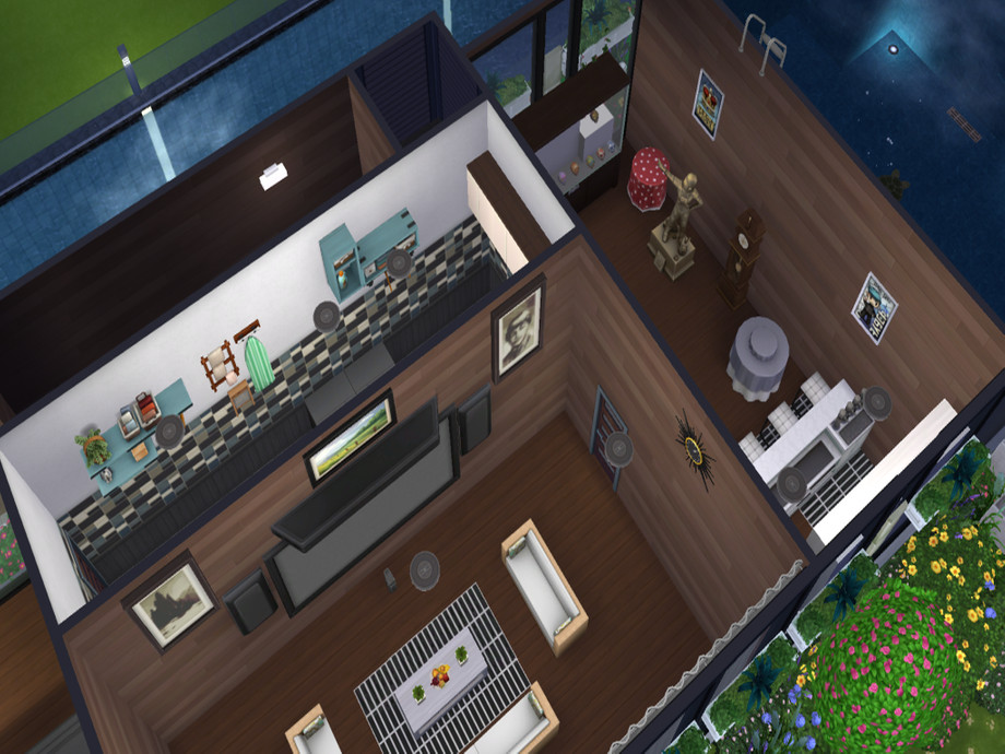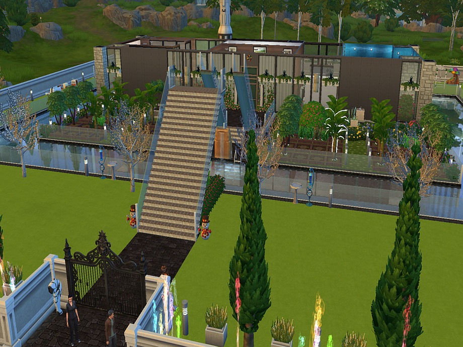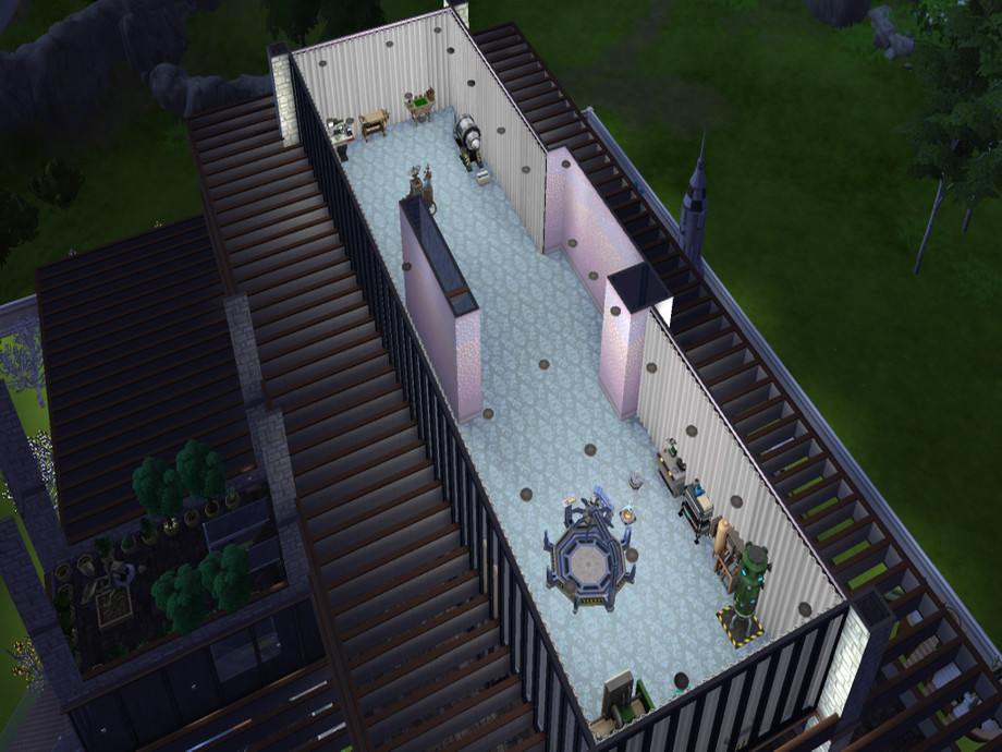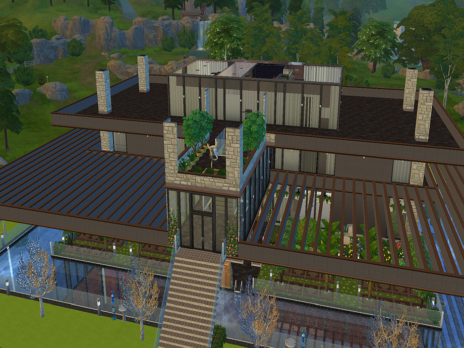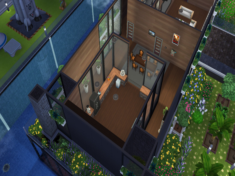 A bridge connecting the home to the garden, is at first floor height because of game restrictions (no bridges allowed at foundation height).