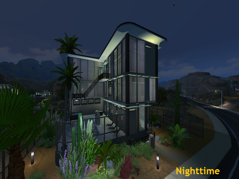 That trailer lot was an eyesore!, the new Sim owner of the lot known as Slipshod Mesquite in Oasis Springs said. It brought down property values in the neighborhood. I wanted a home that completely changed the look and feel of where we lived, not just for us, but everyone around us as well. This imposing desert home appears to meet that criteria. Skylights dominate the upper level, giving an open, light and airy look, allowing the outside in. On the top third floor, two bedrooms, themselves with said skylights, are joined by a large hallway that has an opening that reaches all the way down to the first floor. There are game activities your Sim can participate in. A full bath with a mini skylight completes the ensemble. The second floor has two more bedrooms, with a full bath, and a piano open area. The first floor has a HUGE kitchen, dining room, sunken living room, and full bath, as well as a very nice pool area, along with two bars, one on the inside, and one on the outside. The basement has a laundry room, gym, private sauna, message room, and a full bath. All levels of the upper floors are connected by stairs on the outside, so there's plenty of areas your Sims can access. Finally, despite replacing the old trailer lot, the new owner liked the name, so he kept it for the new home. Please check my notes to get the CC items and other important information. Enjoy!