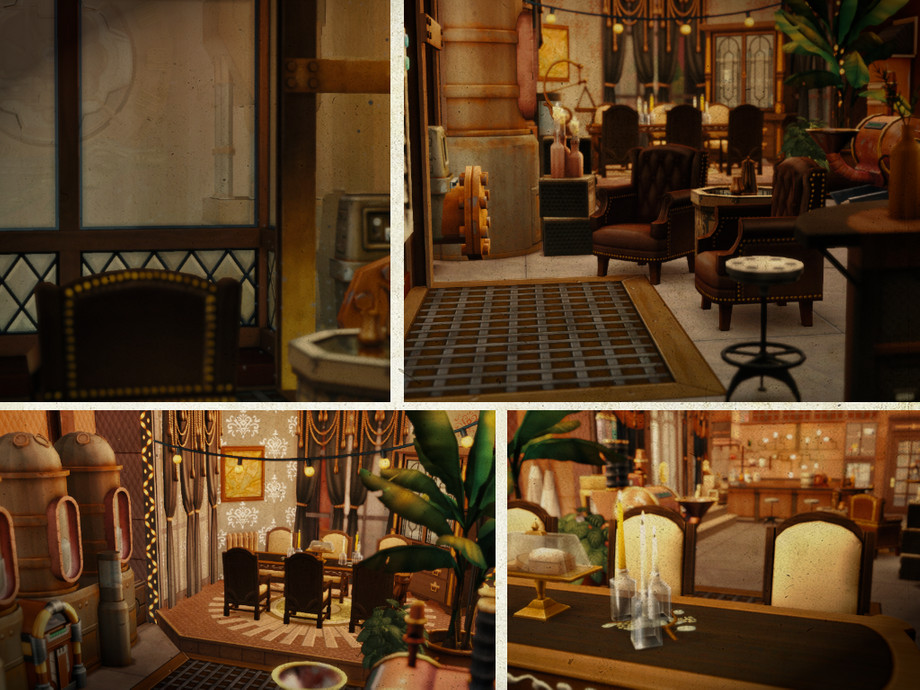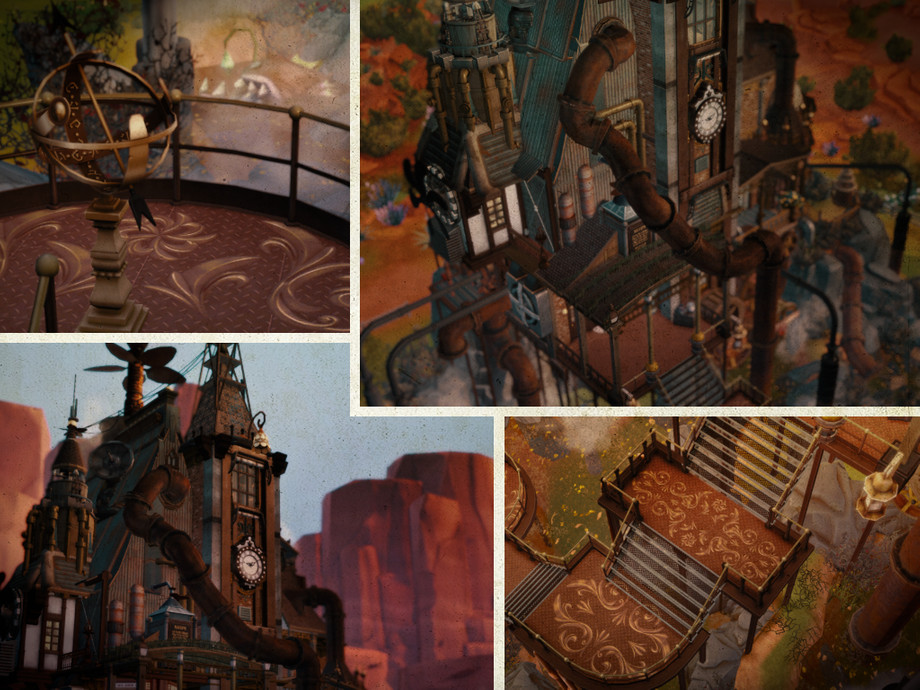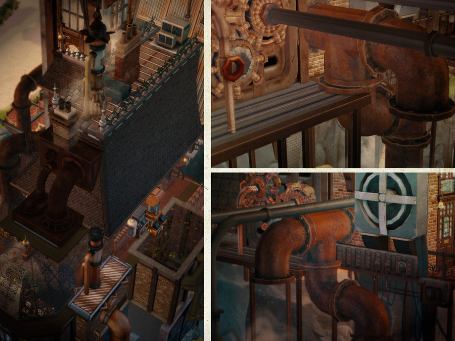 Dust, steam and hydropower keep this mansion alive. The movement makes it seem like a living machine itself. - Turn on the 'ash'-effect at the effects-station upstairs and light the fireplace to activate the steam. You can also turn on the fans on the roofs to have even more movement.