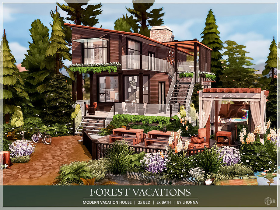 Modern summer cabin with a great outdoor area where a family can find plenty of activities: pool, grill, campfire, chess, and more. The house has space for 7 Sims of different ages, from infants to adults.