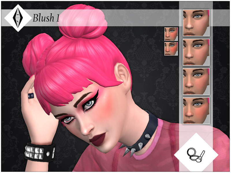 Blush that covers the upper cheeks and the nose tip, with a couple of highlights and shadows. Composition method 2, meaning it should work with all EA makeup. It comes in 6 different saturations, in the same reddish color. Hue and Opacity sliders are unlocked so it should work with any skintone.