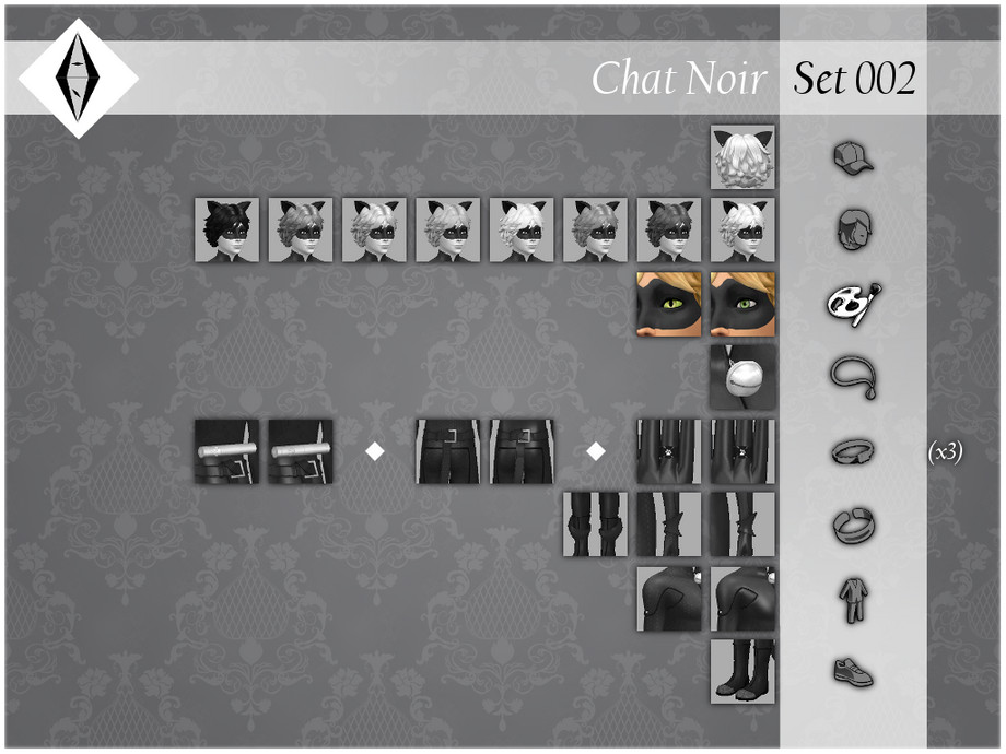 The mask has two swatches, one with eyes (taken directly from the show) and one without. The shape in S4S is the one of Chat, but due to the fact that it's not a mesh but texture, it deforms depending on how the face is shaped. You can find it in Face Paint category (there might be an issue with CC skins that are in Skin Detail category). It's disallowed for random.