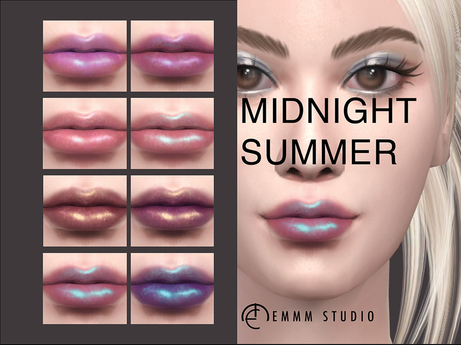 Shiny lip gloss with 8 swatches features gold, purple, and blue shimmer.