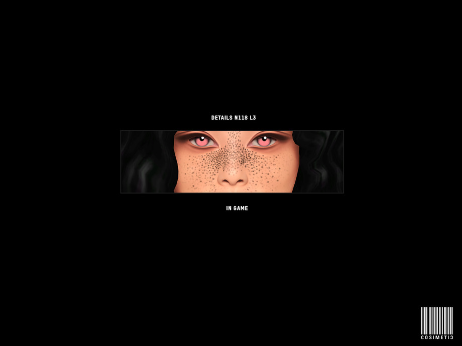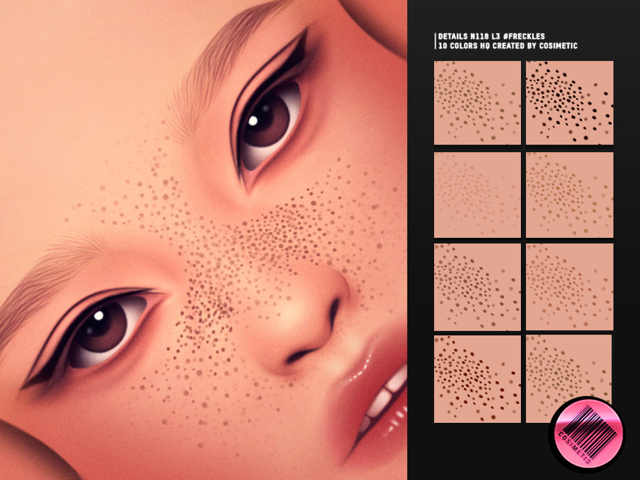 This version features the most intense freckle pattern across the entire face. It is especially concentrated around the nose and cheeks, creating a bold yet still natural effect. Comes in 10 soft skin tones and is suitable for both male and female Sims.